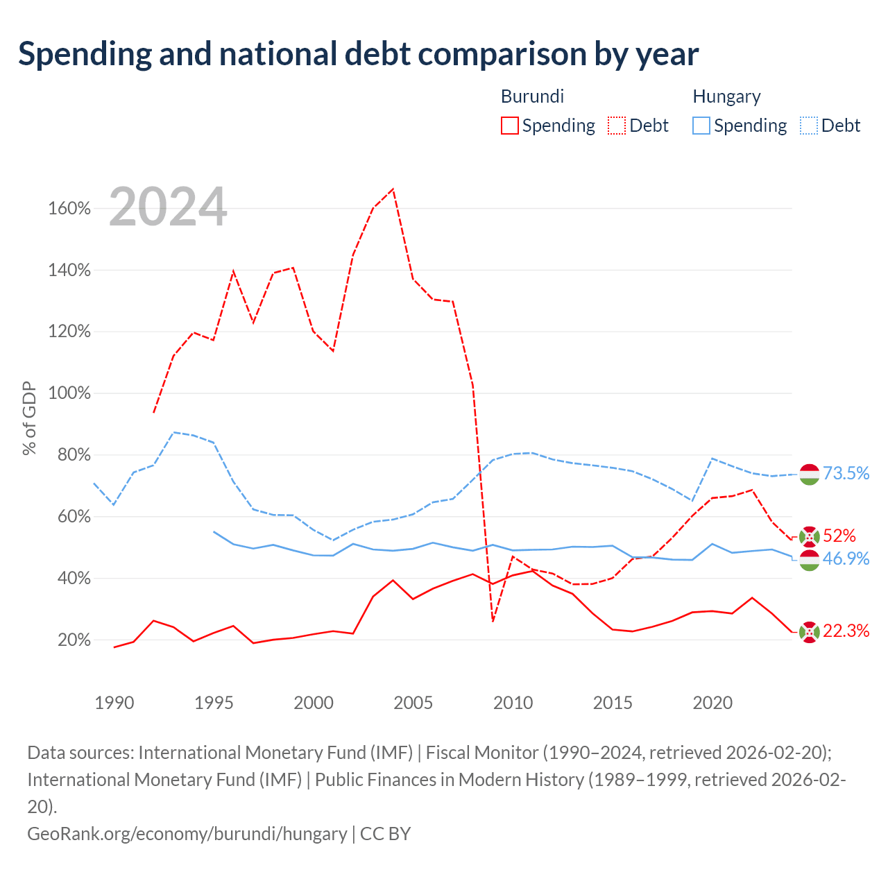 Burundi has $1.6B in government debt (52% of GDP), compared to $164B (73.5% of GDP) in Hungary.