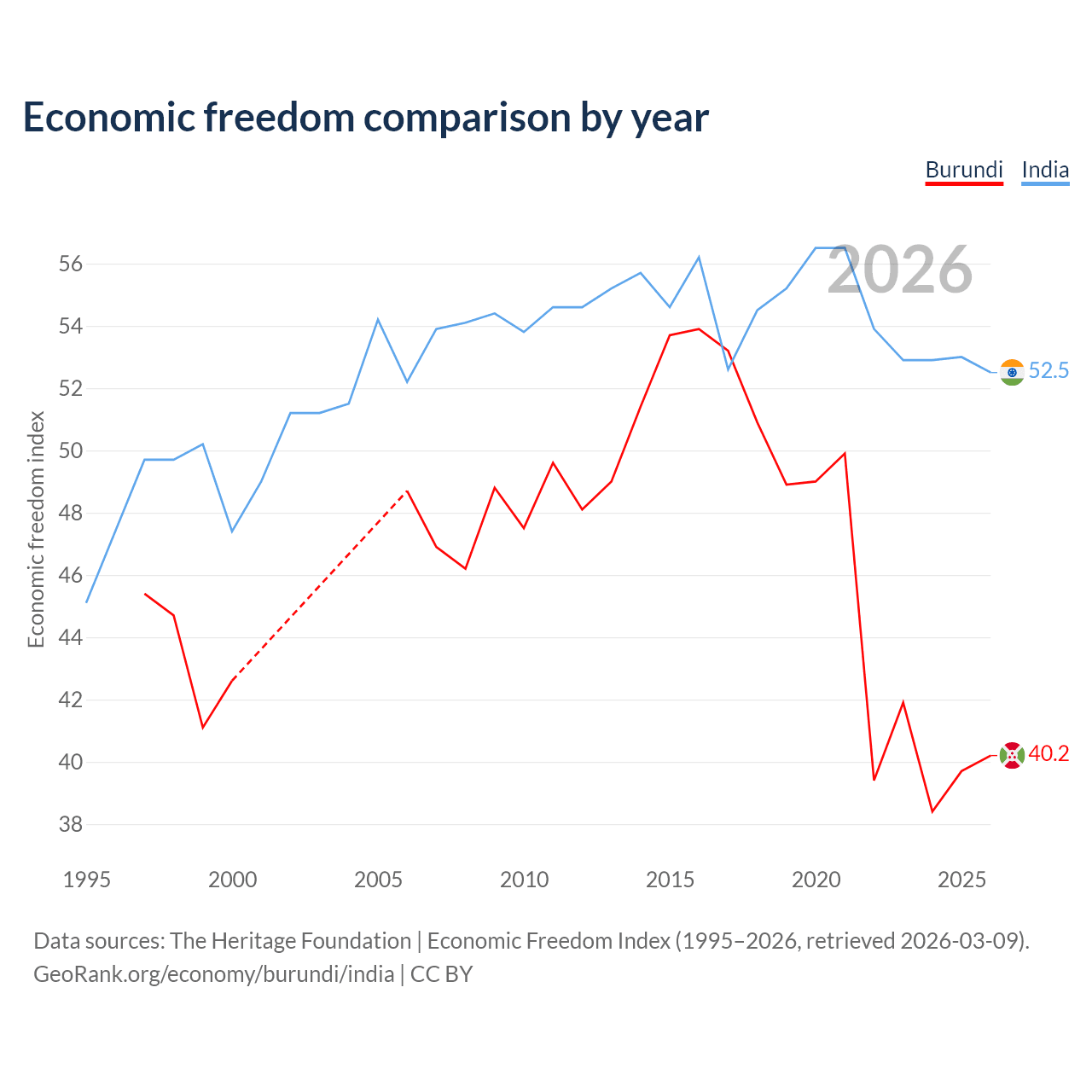 The Economic Freedom Index for Burundi is 40.2, ranking 187/197, compared to 52.5 for India, ranking 146/197. The chart above displays a comparison of annual changes in economic freedom indexes.