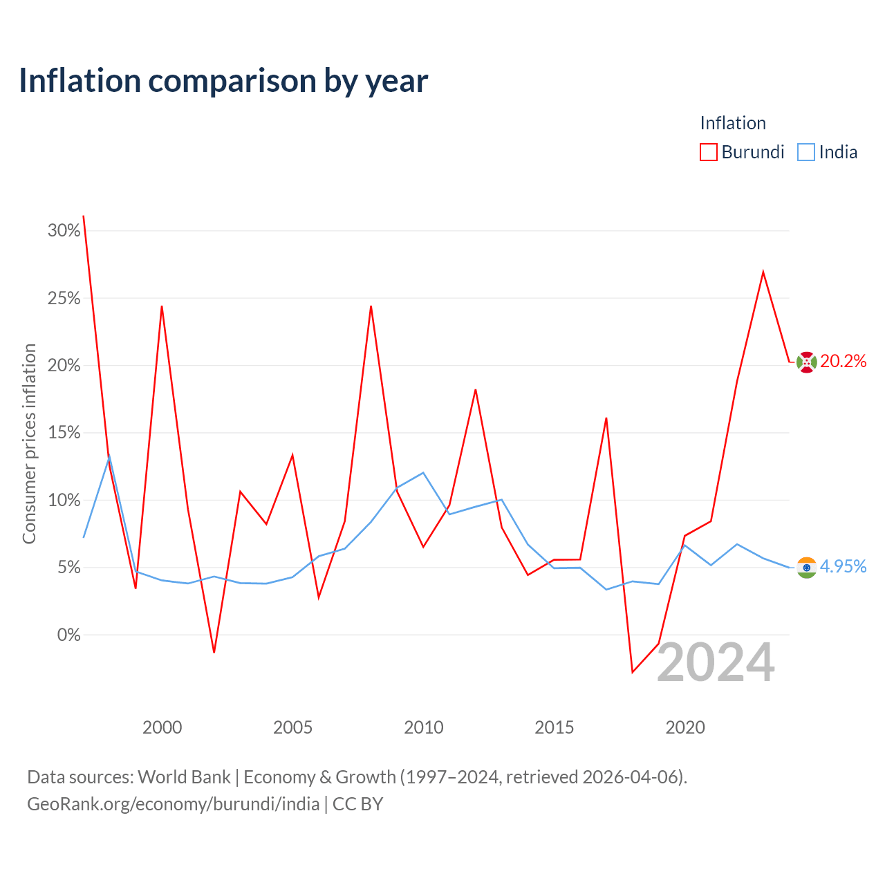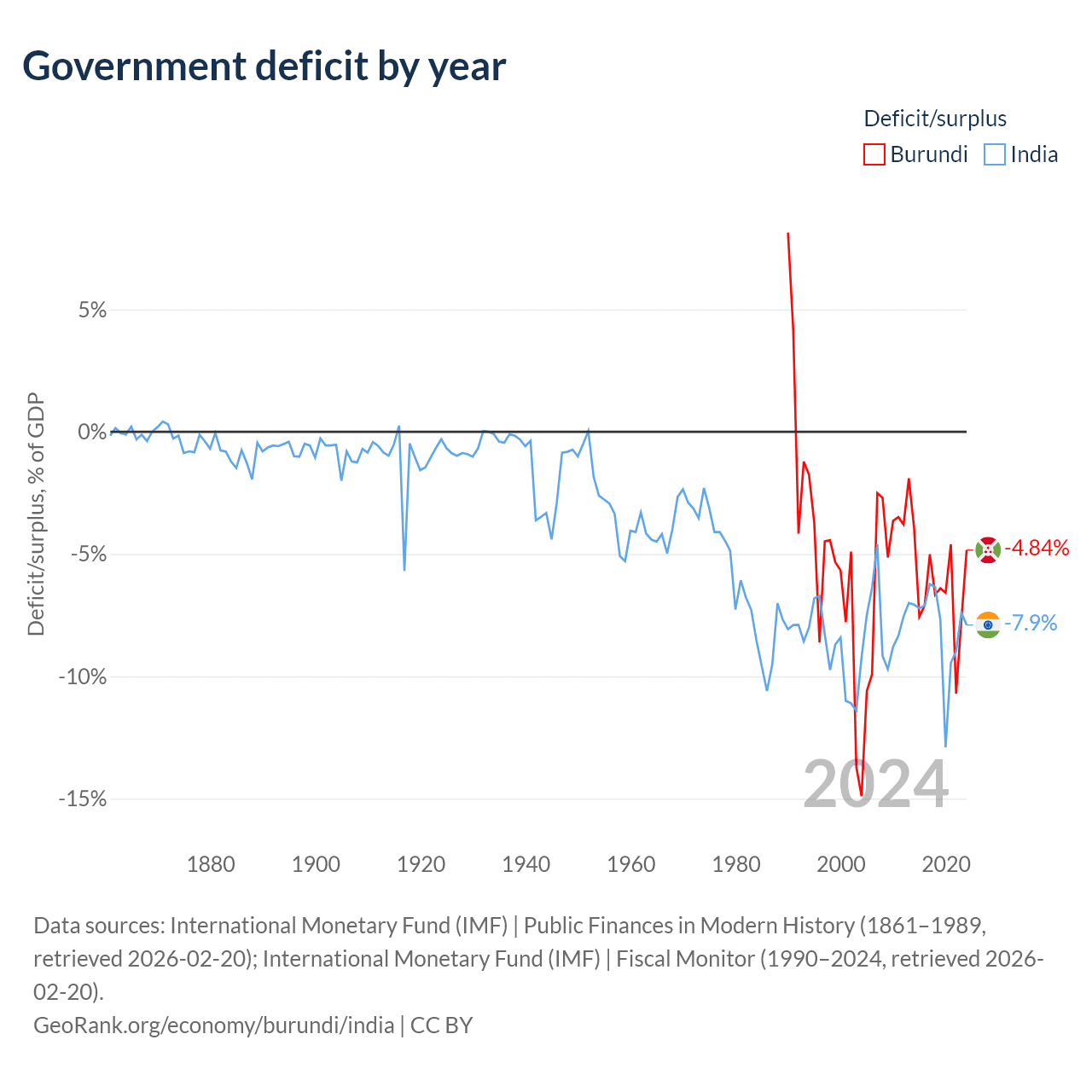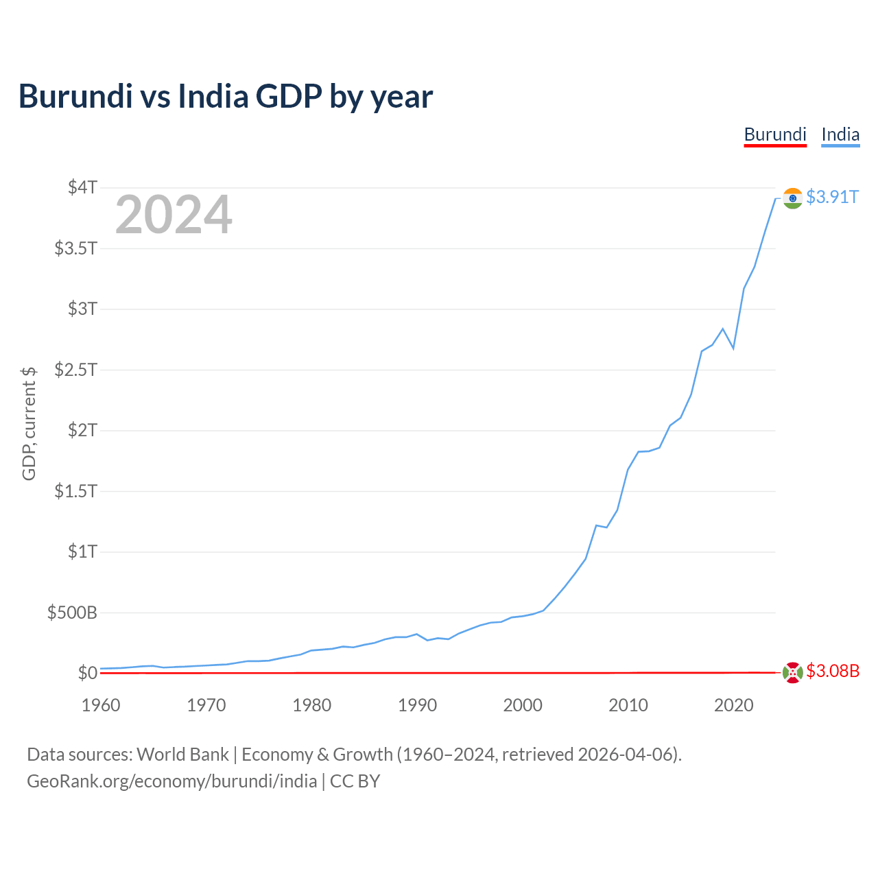 Burundi has a GDP of $3.08B compared to $3.91T for India, ranking 169/197 and 5/197 by economy size, respectively.
