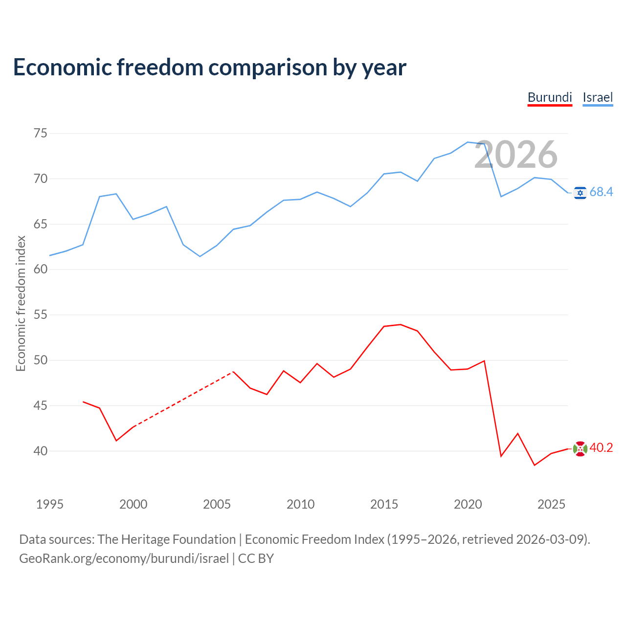 The Economic Freedom Index for Burundi is 40.2, ranking 187/197, compared to 68.4 for Israel, ranking 47/197. The chart above displays a comparison of annual changes in economic freedom indexes.