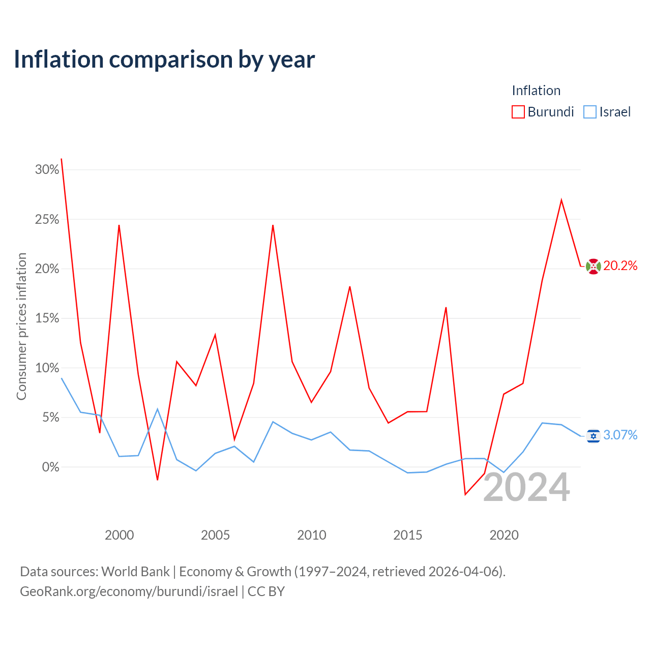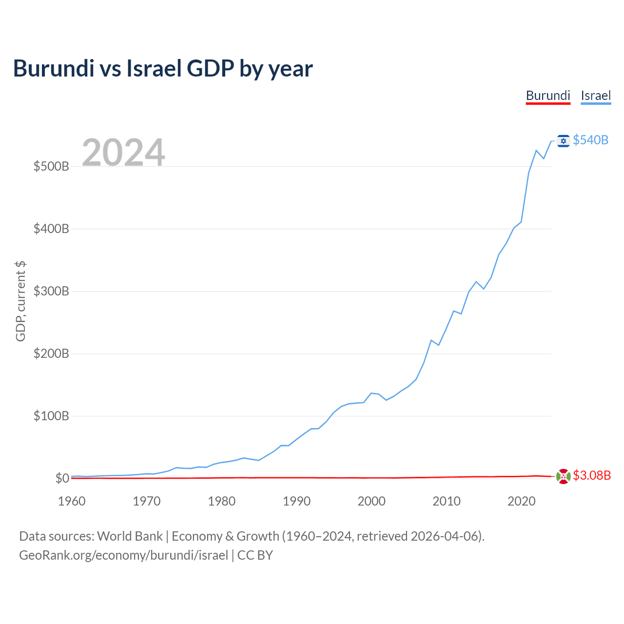 Burundi has a GDP of $3.08B compared to $540B for Israel, ranking 169/197 and 29/197 by economy size, respectively.