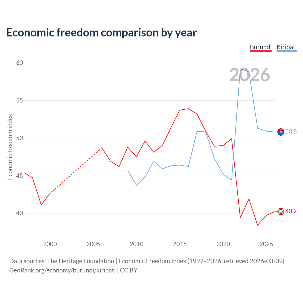 The Economic Freedom Index for Burundi is 40.2, ranking 187/197, compared to 50.8 for Kiribati, ranking 158/197. The chart above displays a comparison of annual changes in economic freedom indexes.