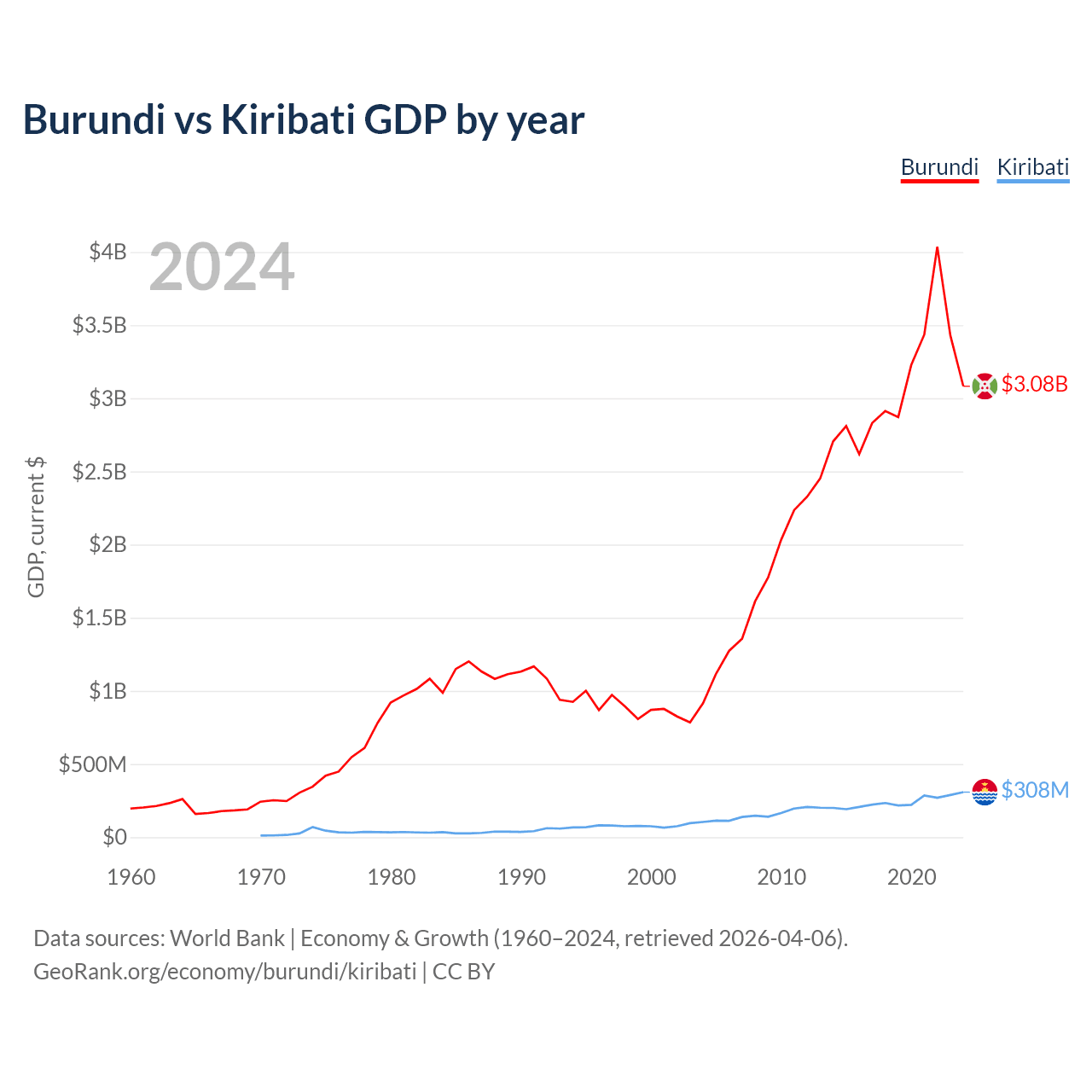Burundi has a GDP of $3.08B compared to $308M for Kiribati, ranking 169/197 and 192/197 by economy size, respectively.