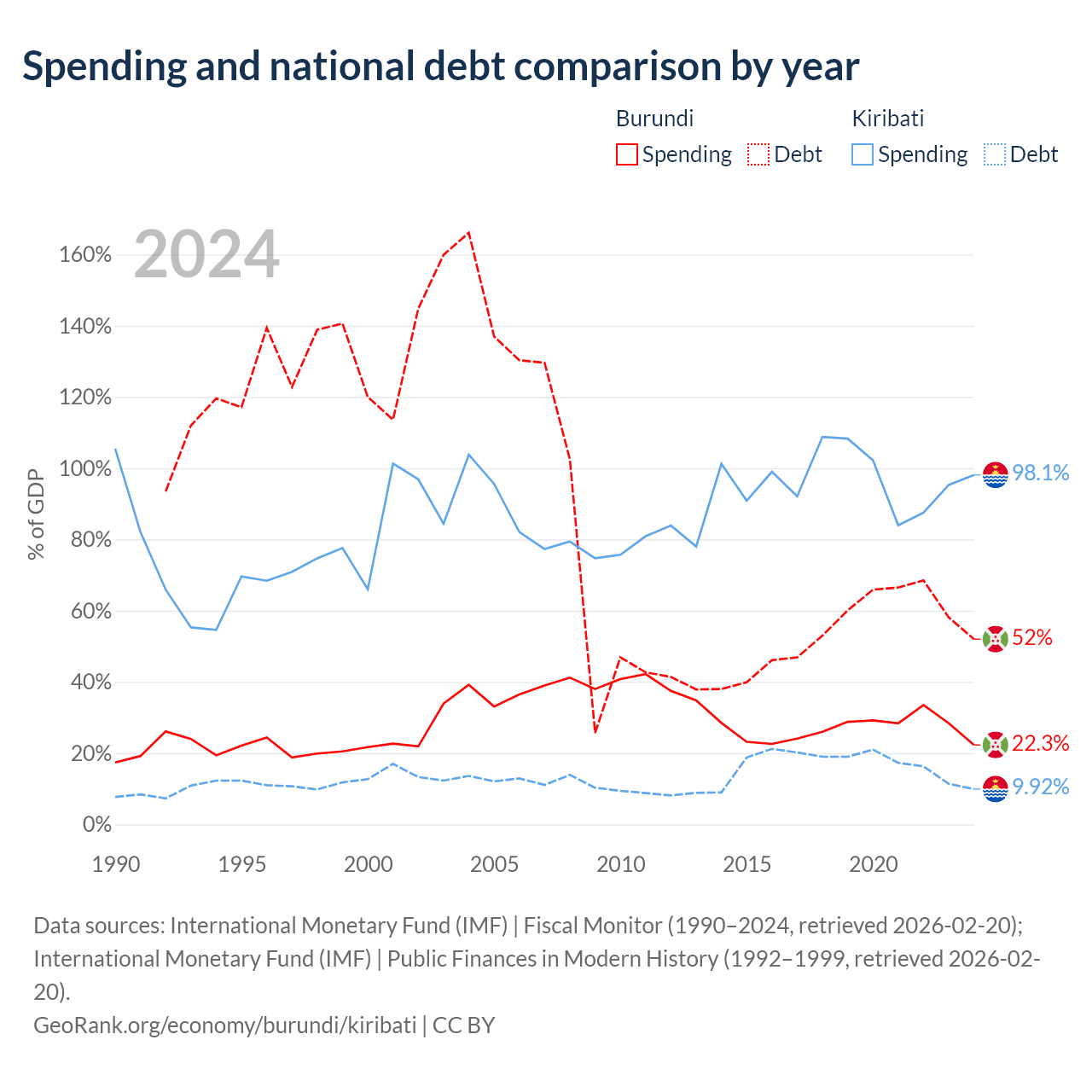 Burundi has $1.6B in government debt (52% of GDP), compared to $30.5M (9.92% of GDP) in Kiribati.