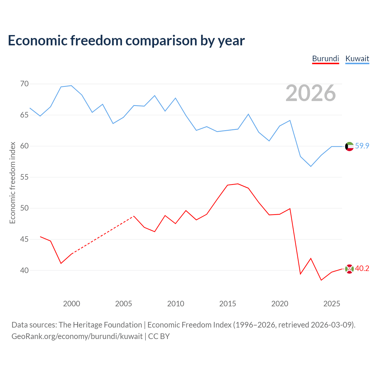 The Economic Freedom Index for Burundi is 40.2, ranking 187/197, compared to 59.9 for Kuwait, ranking 100/197. The chart above displays a comparison of annual changes in economic freedom indexes.