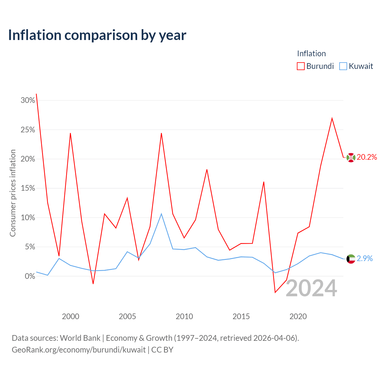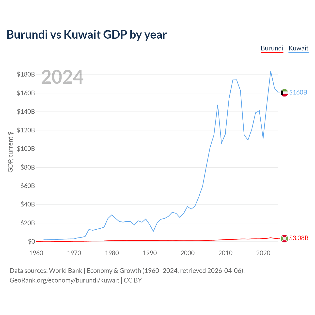 Burundi has a GDP of $3.08B compared to $160B for Kuwait, ranking 169/197 and 59/197 by economy size, respectively.