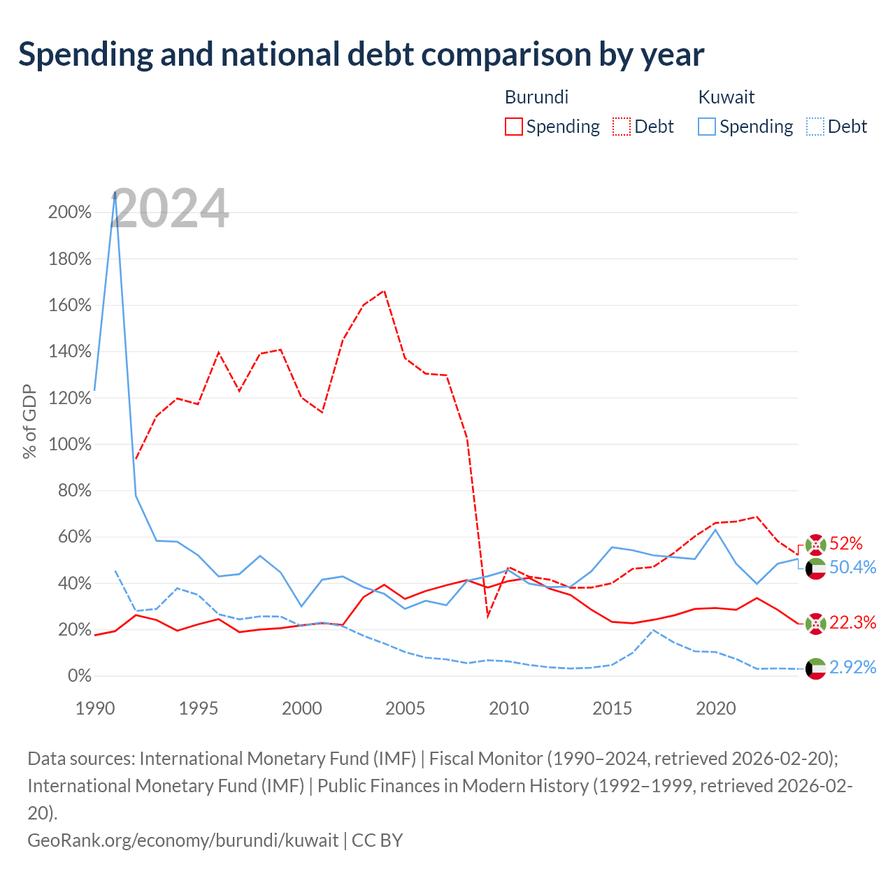 Burundi has $1.6B in government debt (52% of GDP), compared to $4.68B (2.92% of GDP) in Kuwait.