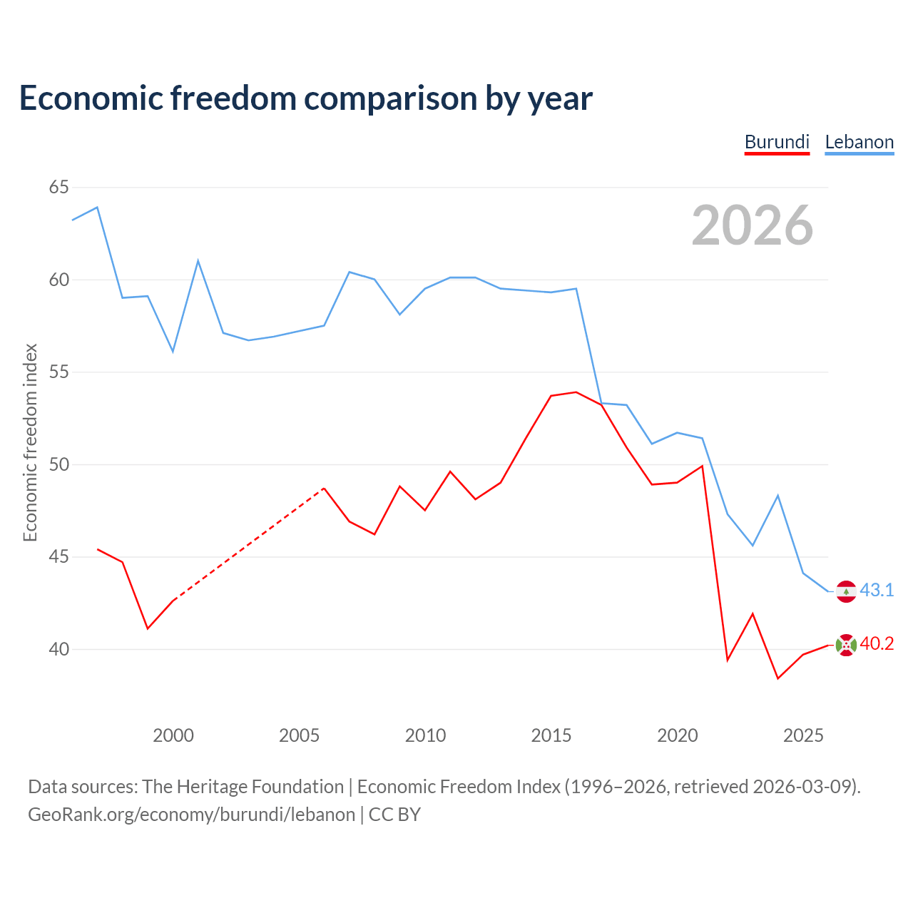 The Economic Freedom Index for Burundi is 40.2, ranking 187/197, compared to 43.1 for Lebanon, ranking 183/197. The chart above displays a comparison of annual changes in economic freedom indexes.