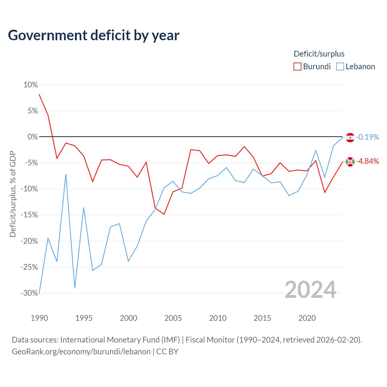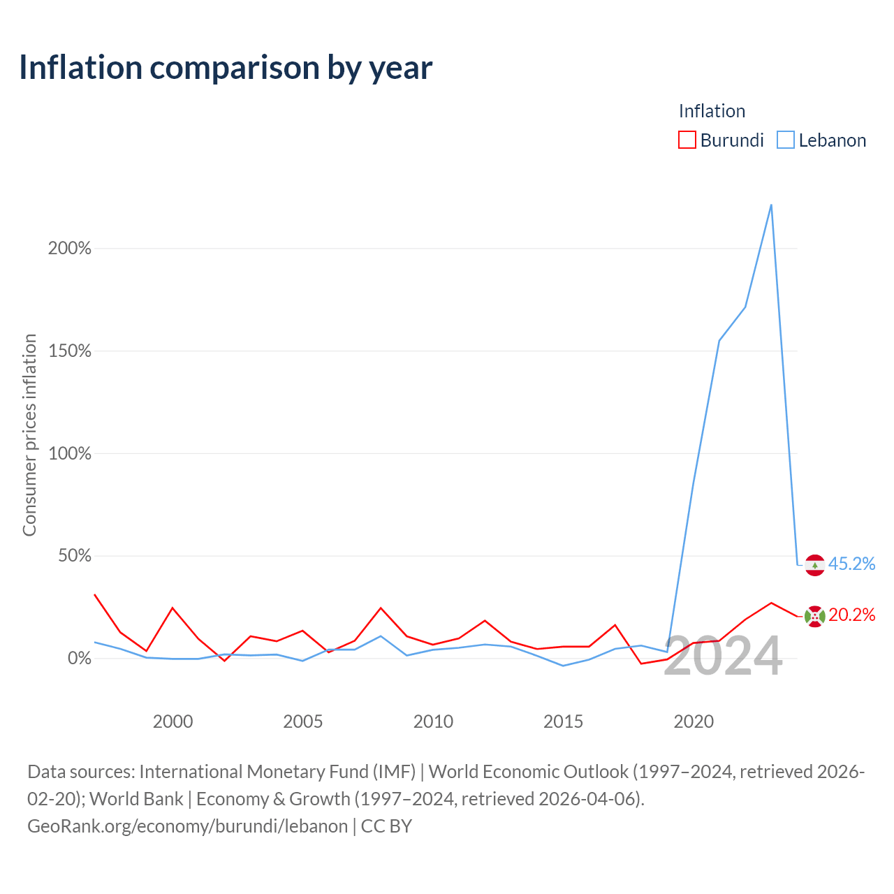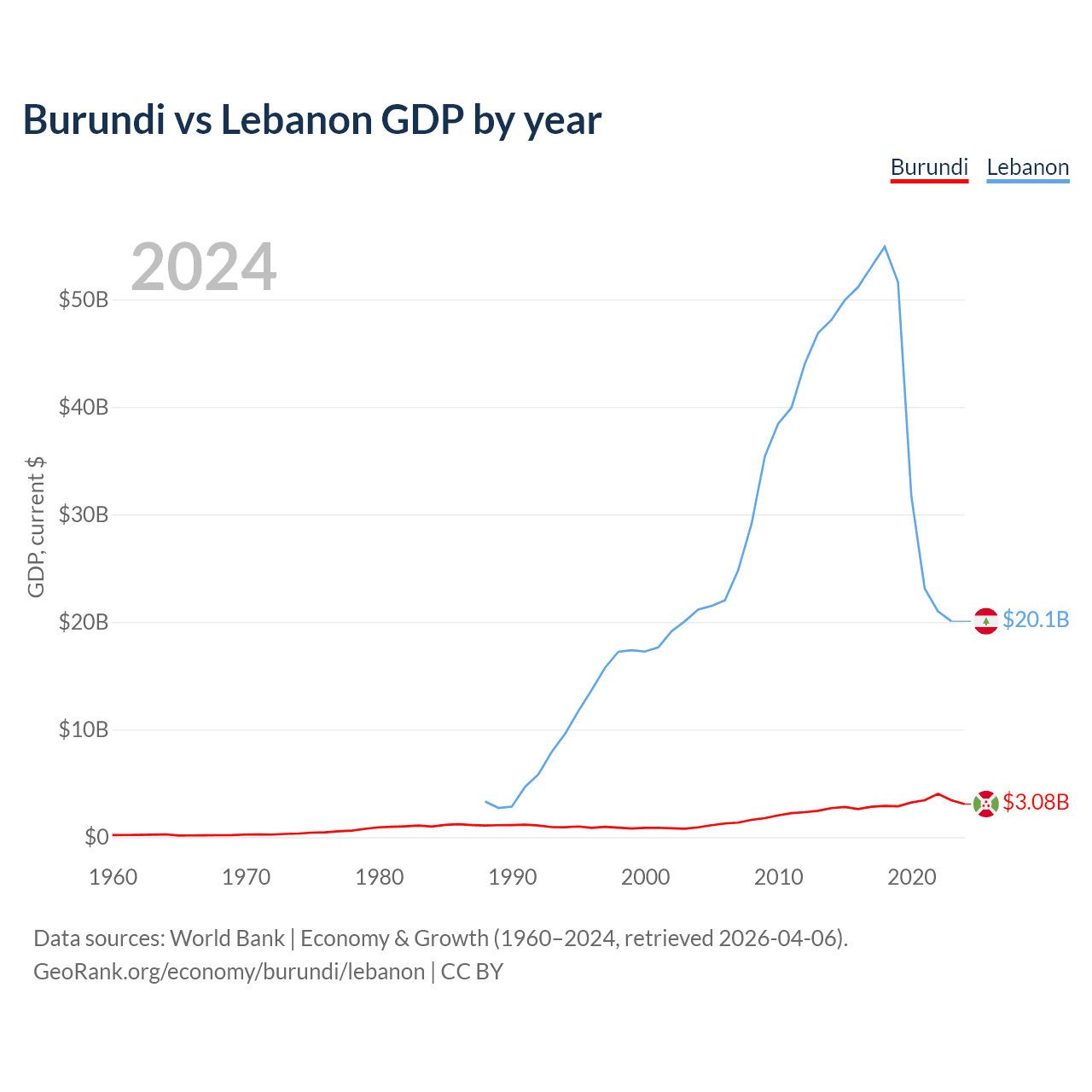Burundi has a GDP of $3.08B compared to $20.1B for Lebanon, ranking 169/197 and 128/197 by economy size, respectively.