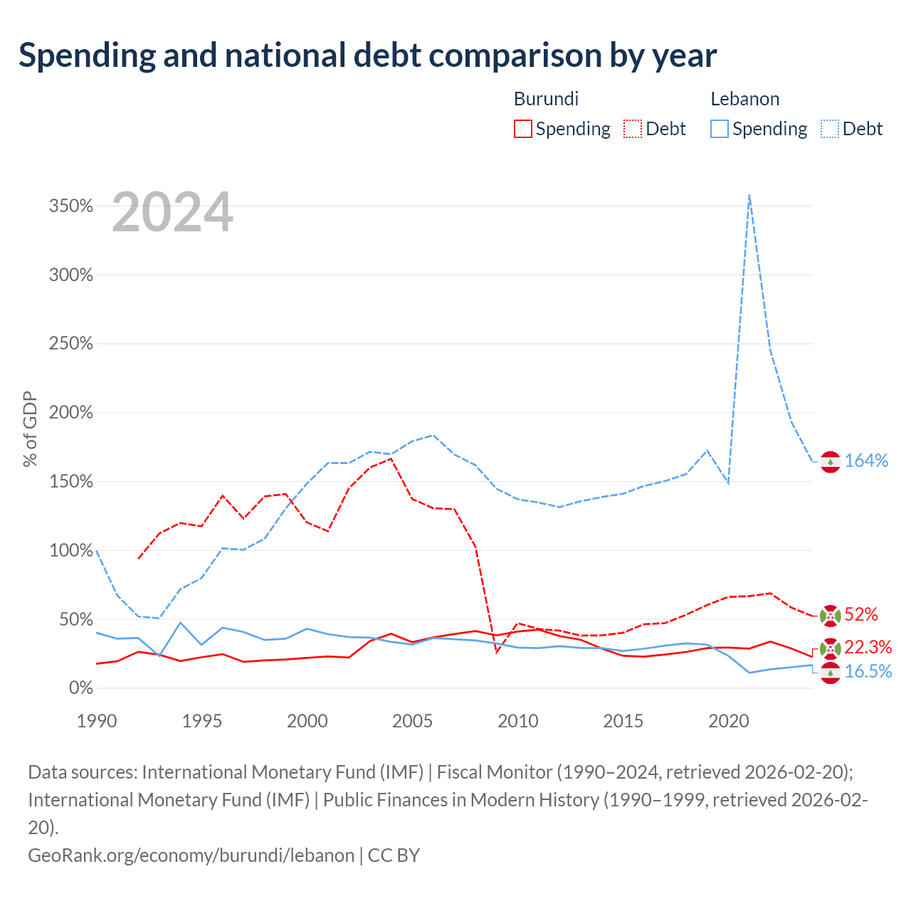Burundi has $1.6B in government debt (52% of GDP), compared to $38.7B (163.8% of GDP) in Lebanon.