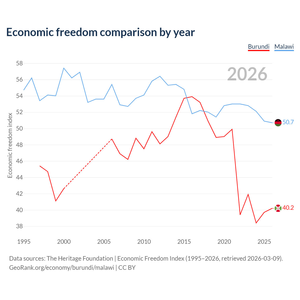 The Economic Freedom Index for Burundi is 40.2, ranking 187/197, compared to 50.7 for Malawi, ranking 159/197. The chart above displays a comparison of annual changes in economic freedom indexes.