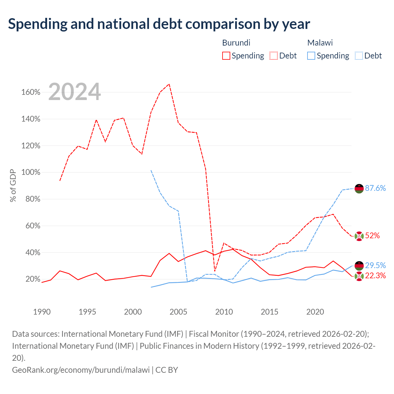 Burundi has $1.6B in government debt (52% of GDP), compared to $9.91B (87.6% of GDP) in Malawi.