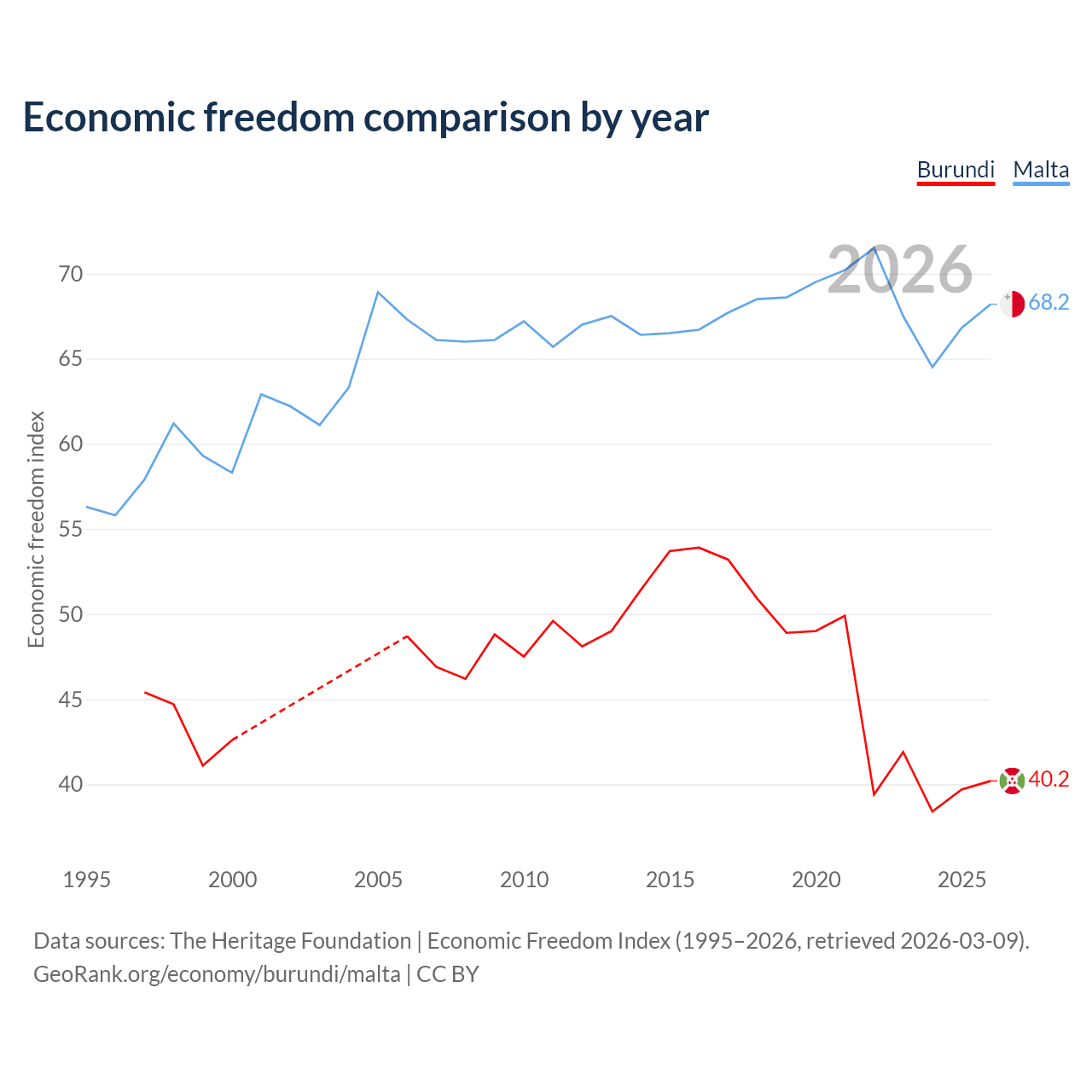 The Economic Freedom Index for Burundi is 40.2, ranking 187/197, compared to 68.2 for Malta, ranking 49/197. The chart above displays a comparison of annual changes in economic freedom indexes.