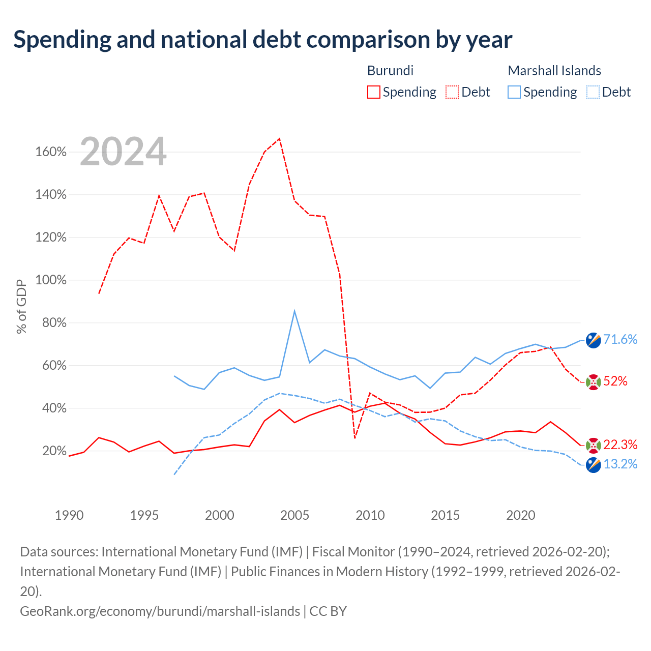 Burundi has $1.6B in government debt (52% of GDP), compared to $38.4M (13.2% of GDP) in the Marshall Islands.