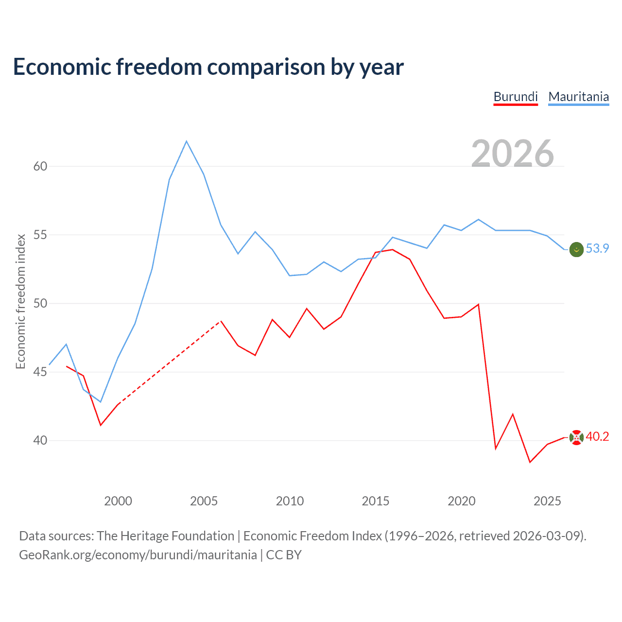 The Economic Freedom Index for Burundi is 39.7, ranking 187/197, compared to 54.9 for Mauritania, ranking 131/197. The chart below displays a comparison of annual changes in economic freedom indexes.