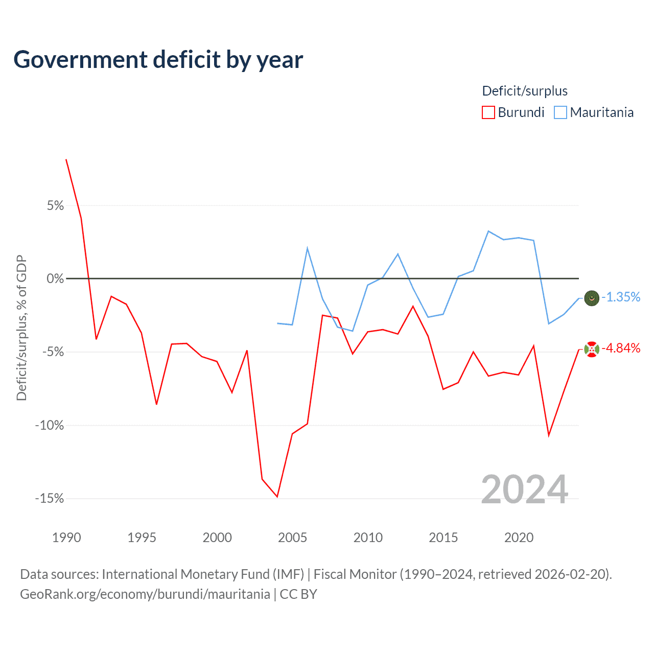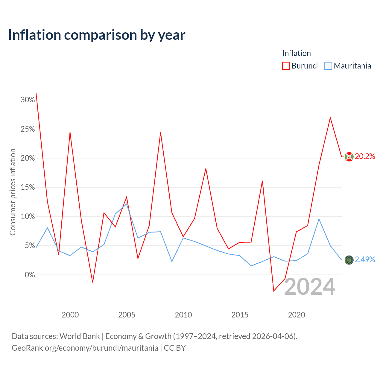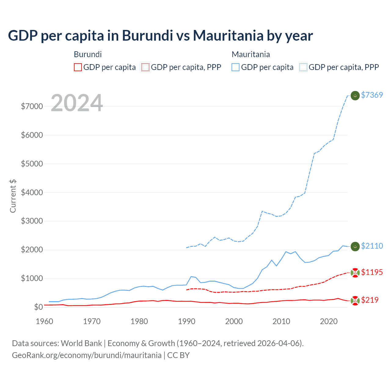 Burundi has a GDP of $3.08B compared to $10.9B for Mauritania, ranking 169/197 and 153/197 by economy size, respectively.