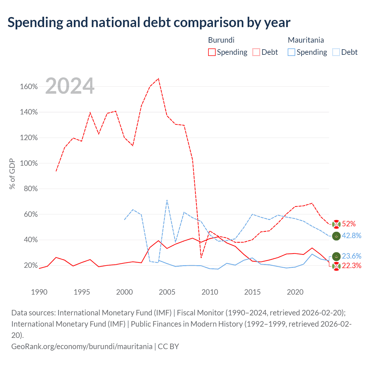 Burundi has $1.33B in government debt (33.2% of GDP), compared to $4.9B (47% of GDP) in Mauritania.
