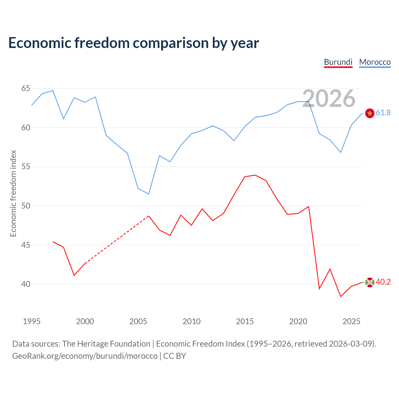 The Economic Freedom Index for Burundi is 40.2, ranking 187/197, compared to 61.8 for Morocco, ranking 91/197. The chart above displays a comparison of annual changes in economic freedom indexes.