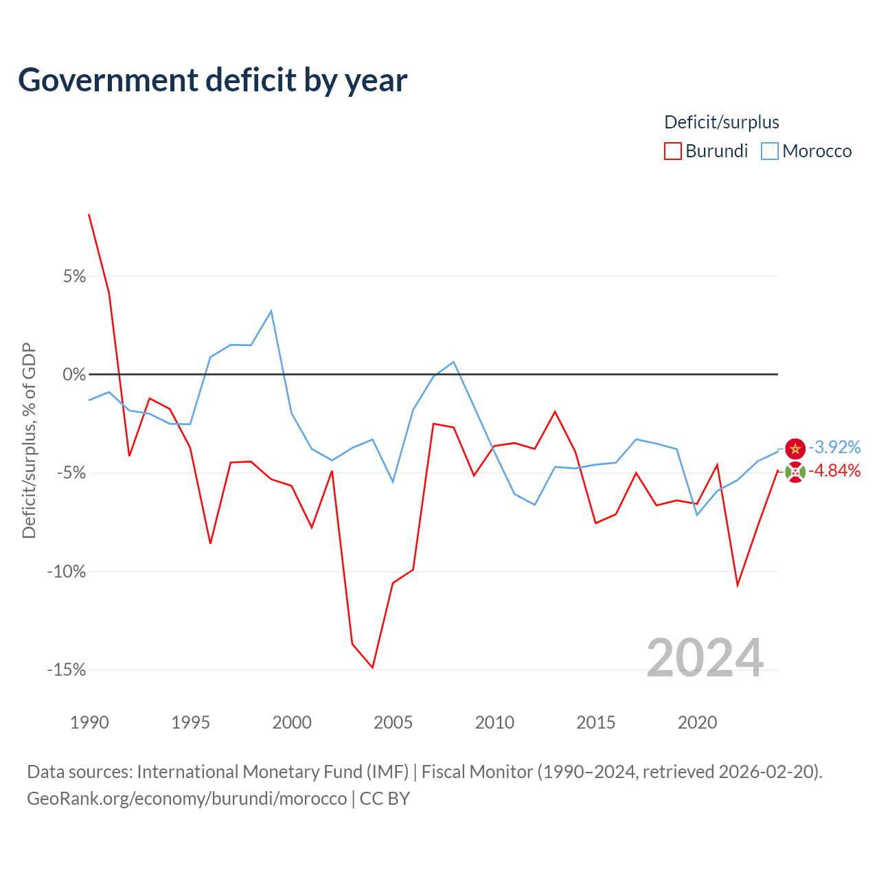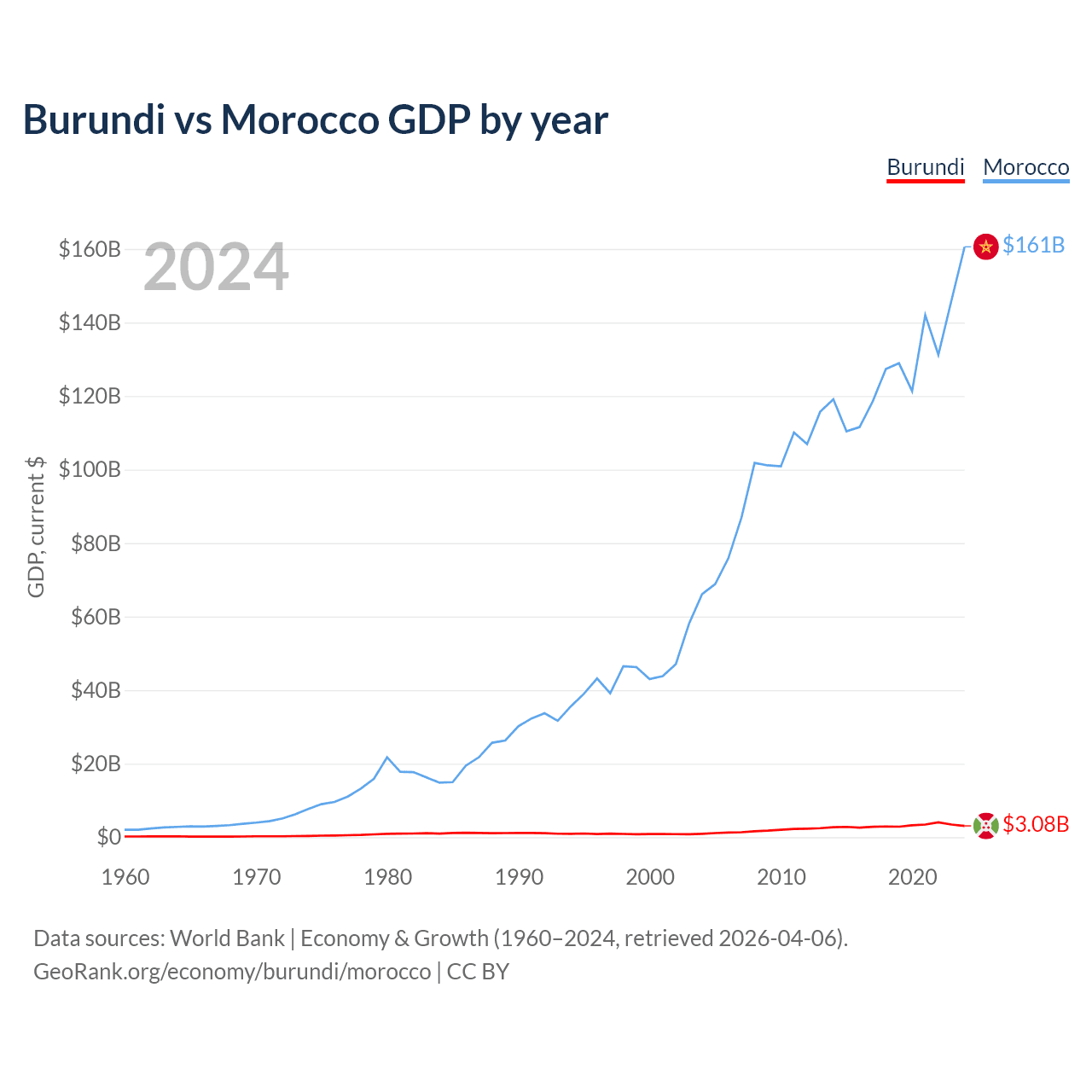 Burundi has a GDP of $3.08B compared to $161B for Morocco, ranking 169/197 and 58/197 by economy size, respectively.