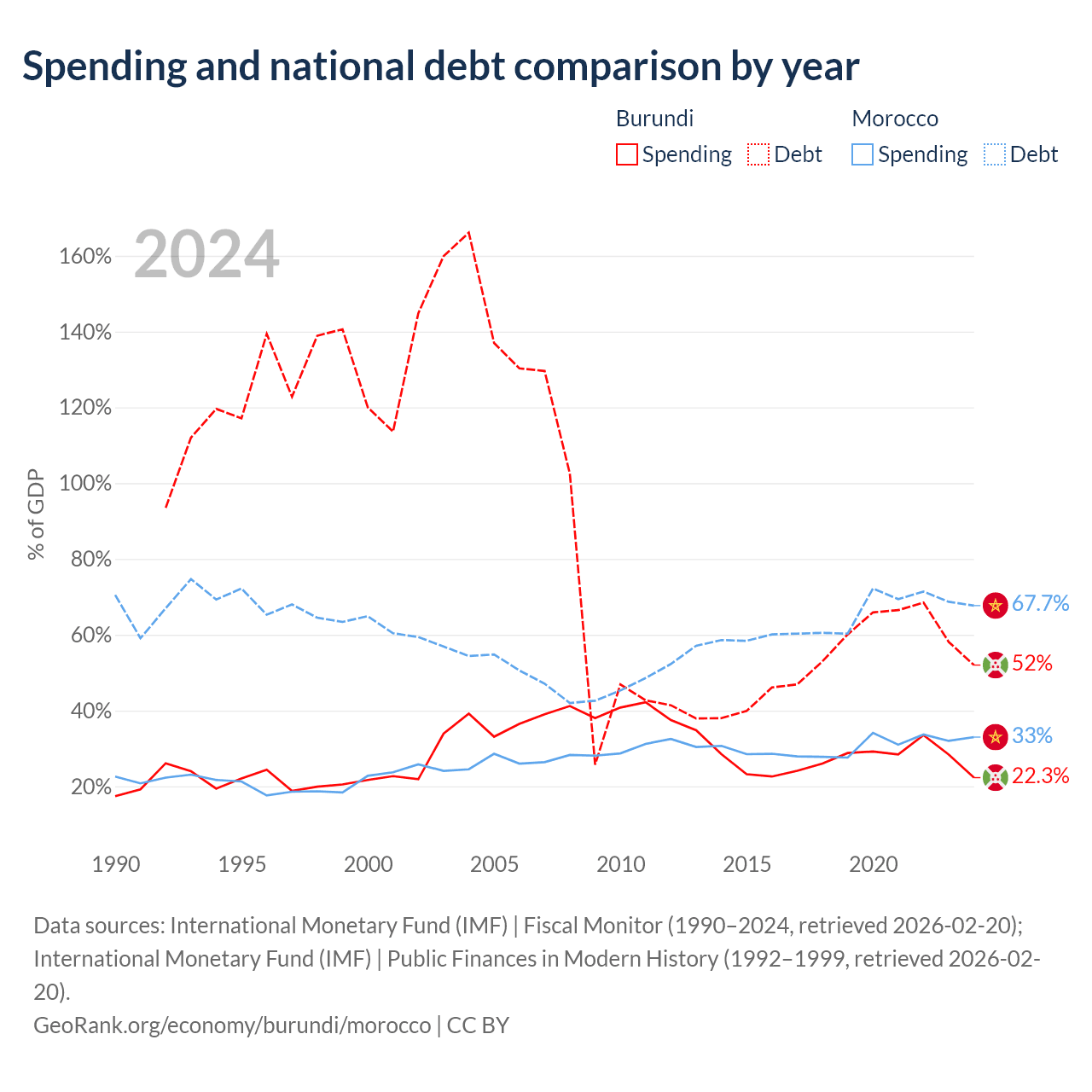 Burundi has $1.6B in government debt (52% of GDP), compared to $109B (67.7% of GDP) in Morocco.