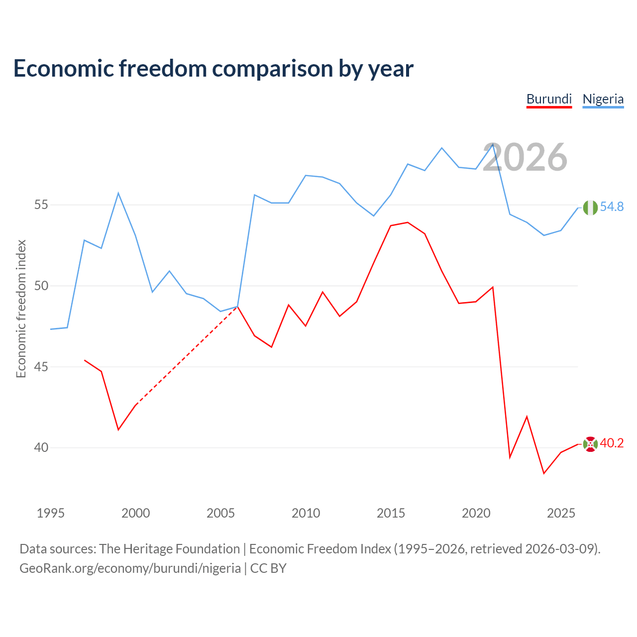 The Economic Freedom Index for Burundi is 40.2, ranking 187/197, compared to 54.8 for Nigeria, ranking 132/197. The chart above displays a comparison of annual changes in economic freedom indexes.