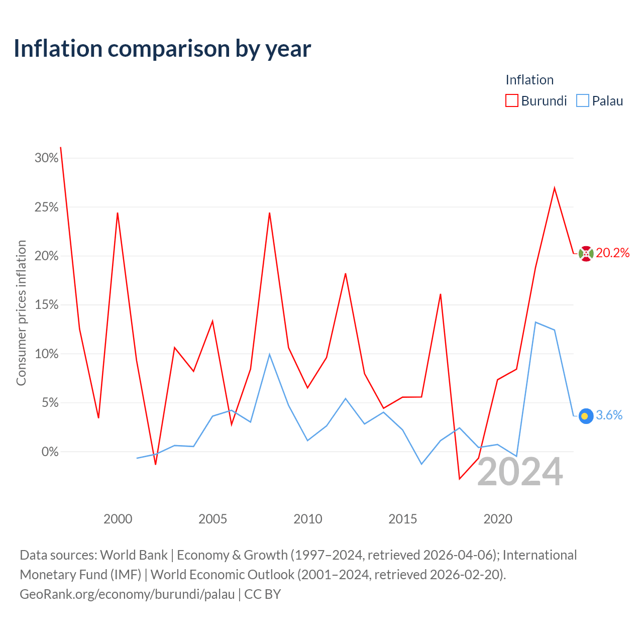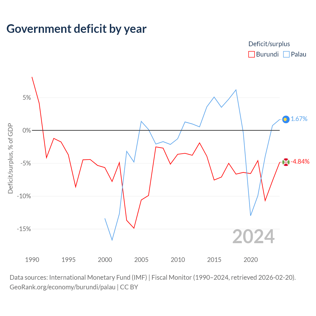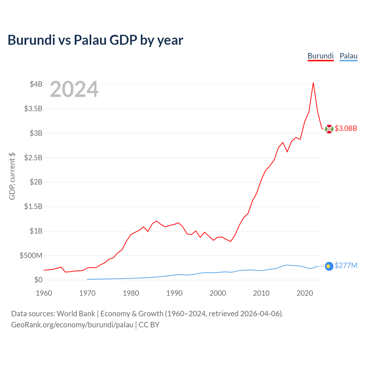 Burundi has a GDP of $3.08B compared to $277M for Palau, ranking 169/197 and 194/197 by economy size, respectively.