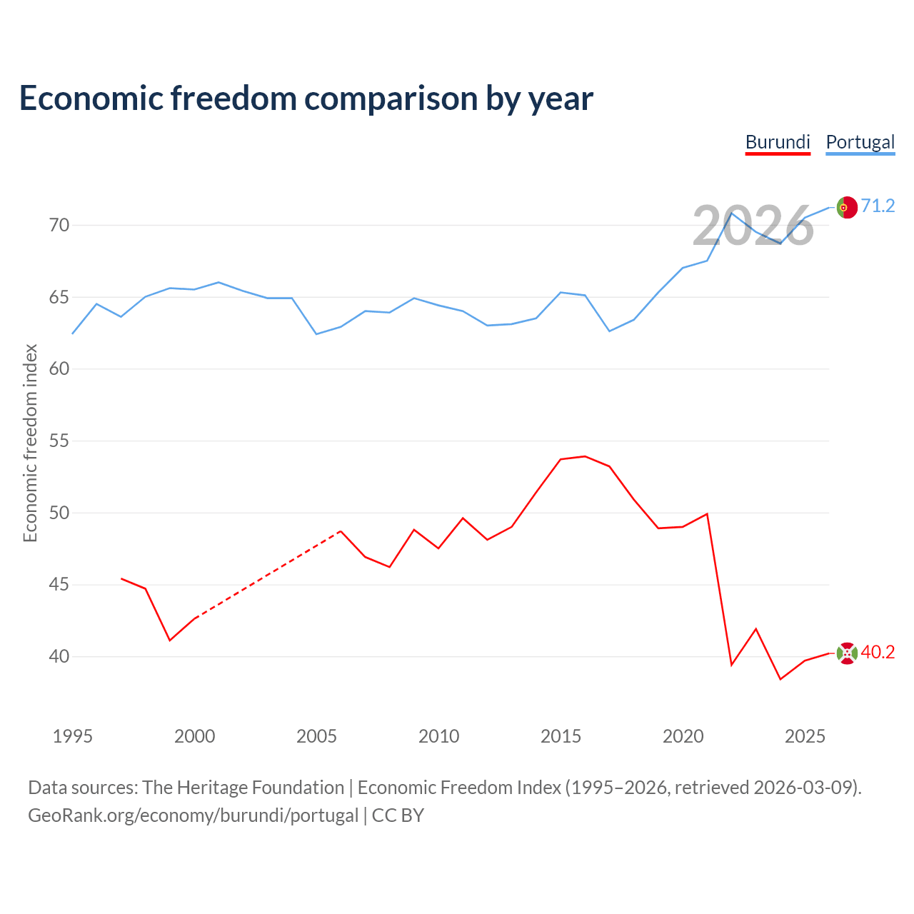 The Economic Freedom Index for Burundi is 40.2, ranking 187/197, compared to 71.2 for Portugal, ranking 33/197. The chart above displays a comparison of annual changes in economic freedom indexes.