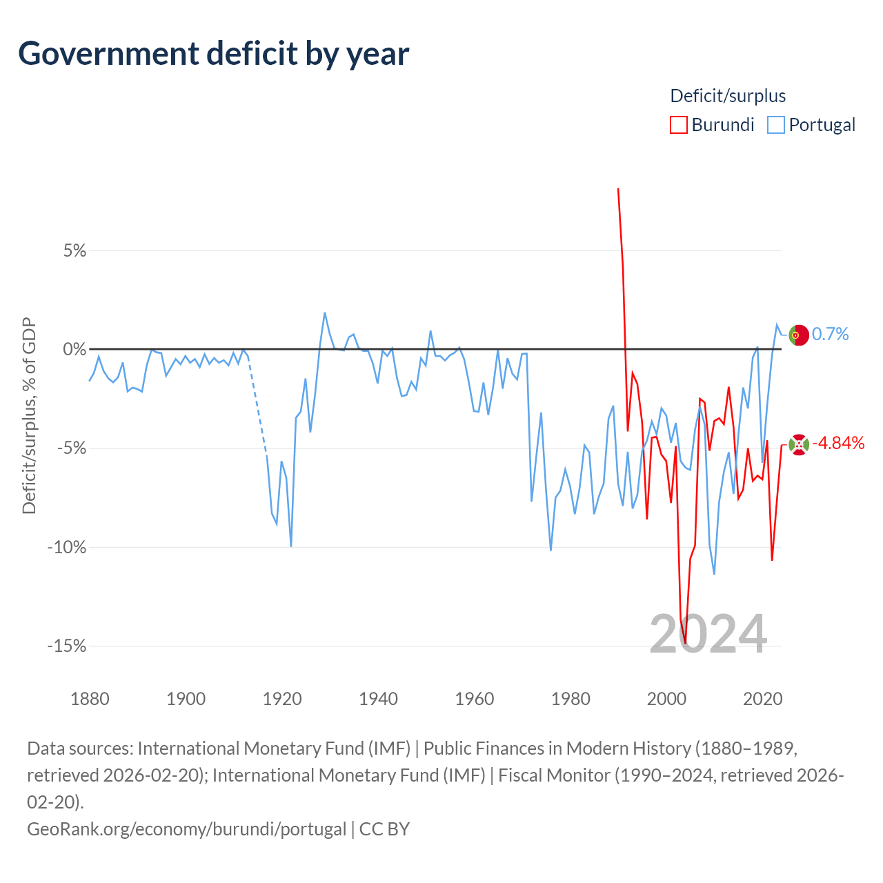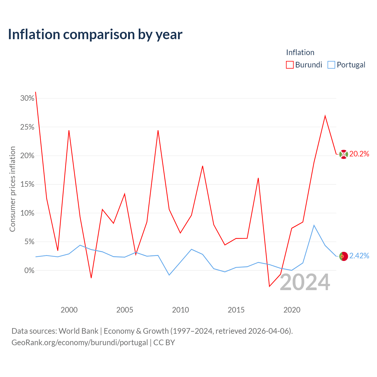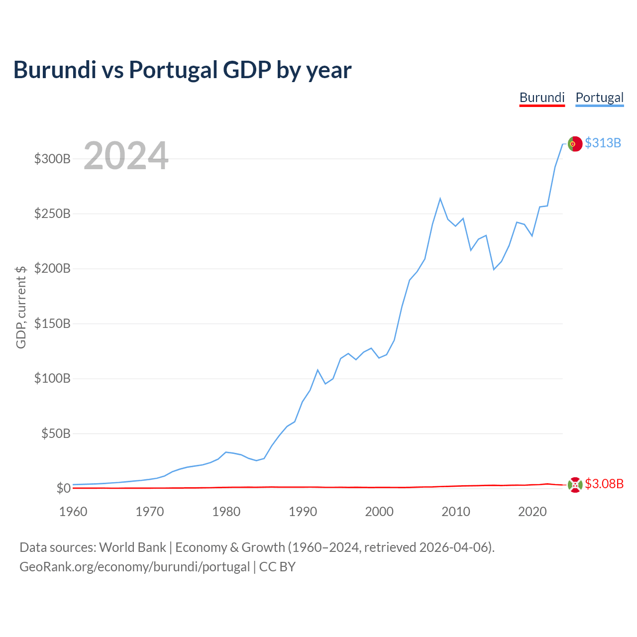 Burundi has a GDP of $3.08B compared to $313B for Portugal, ranking 169/197 and 46/197 by economy size, respectively.