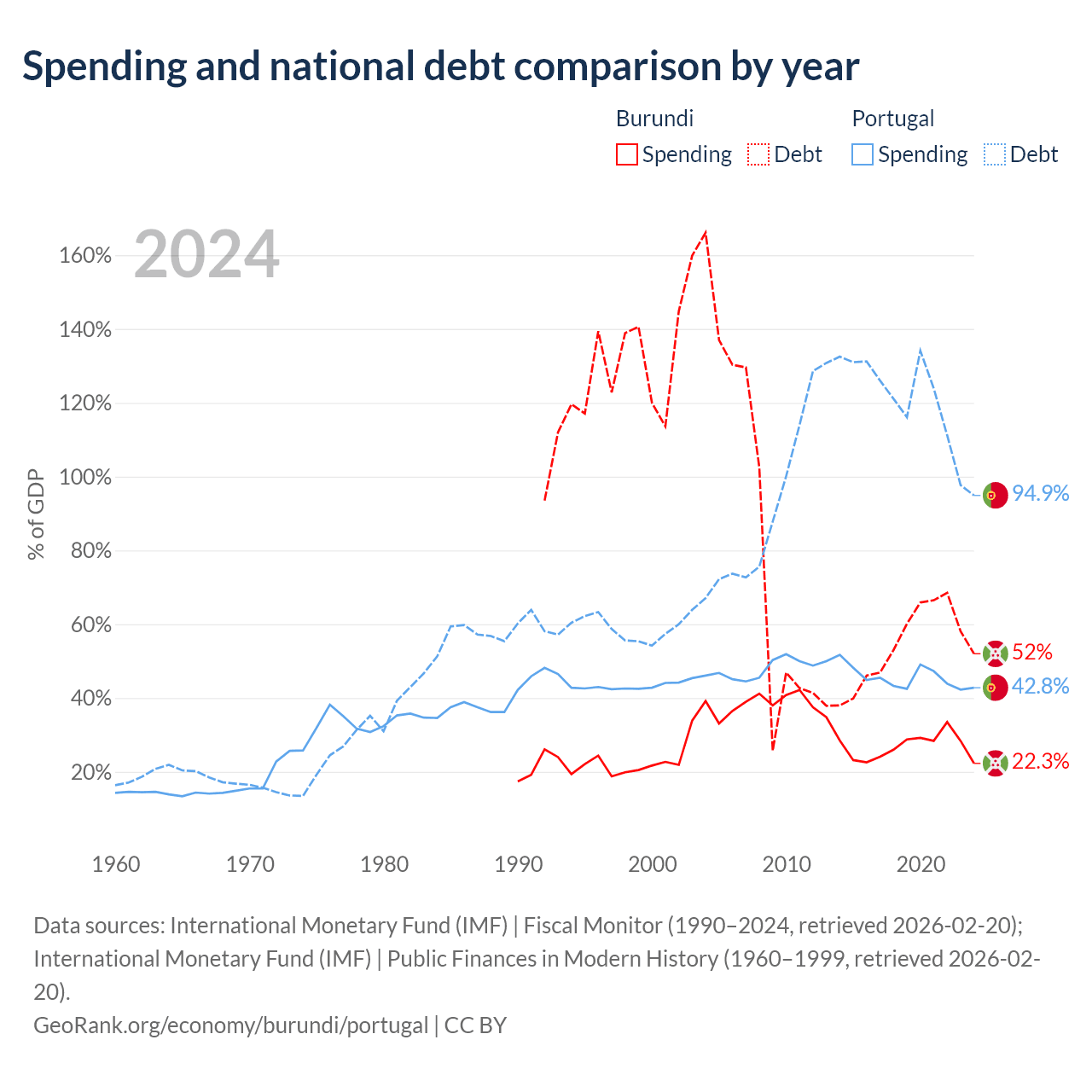 Burundi has $1.6B in government debt (52% of GDP), compared to $297B (94.9% of GDP) in Portugal.
