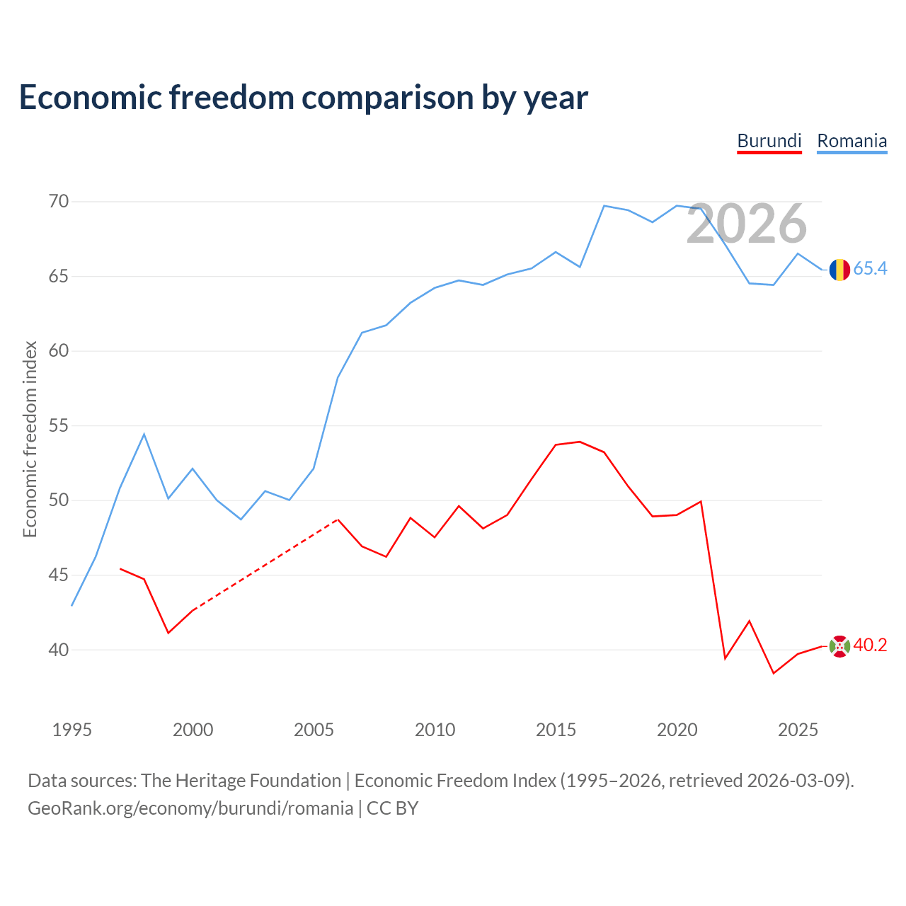 The Economic Freedom Index for Burundi is 40.2, ranking 187/197, compared to 65.4 for Romania, ranking 64/197. The chart above displays a comparison of annual changes in economic freedom indexes.