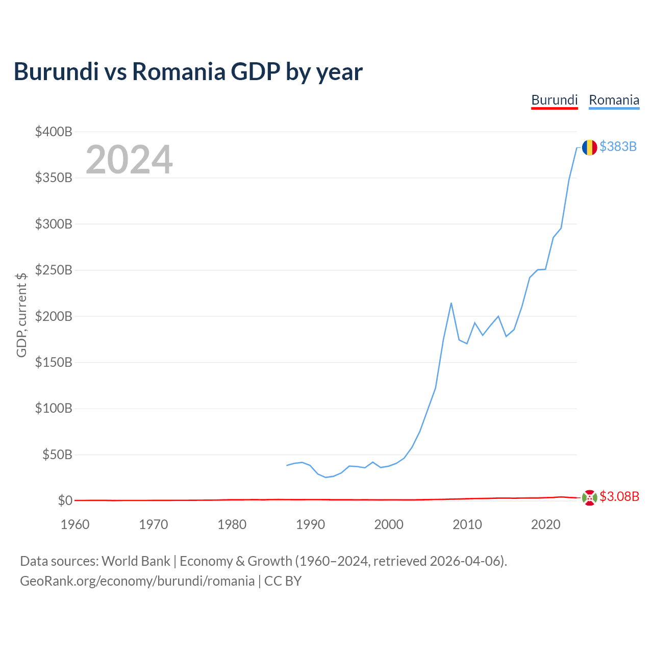 Burundi has a GDP of $3.08B compared to $383B for Romania, ranking 169/197 and 42/197 by economy size, respectively.