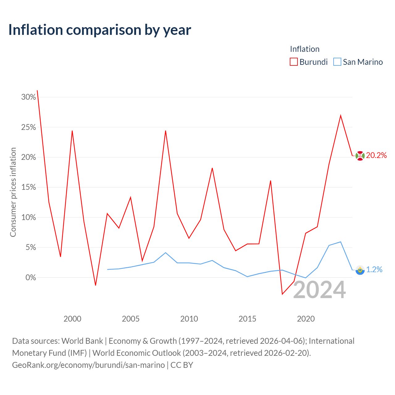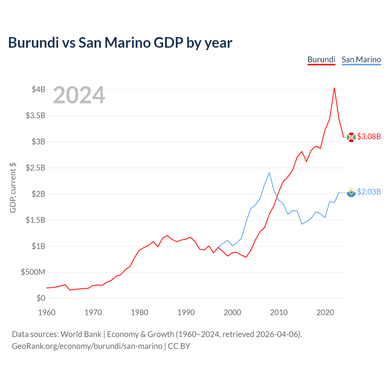 Burundi has a GDP of $3.08B compared to $2.03B for San Marino, ranking 169/197 and 180/197 by economy size, respectively.