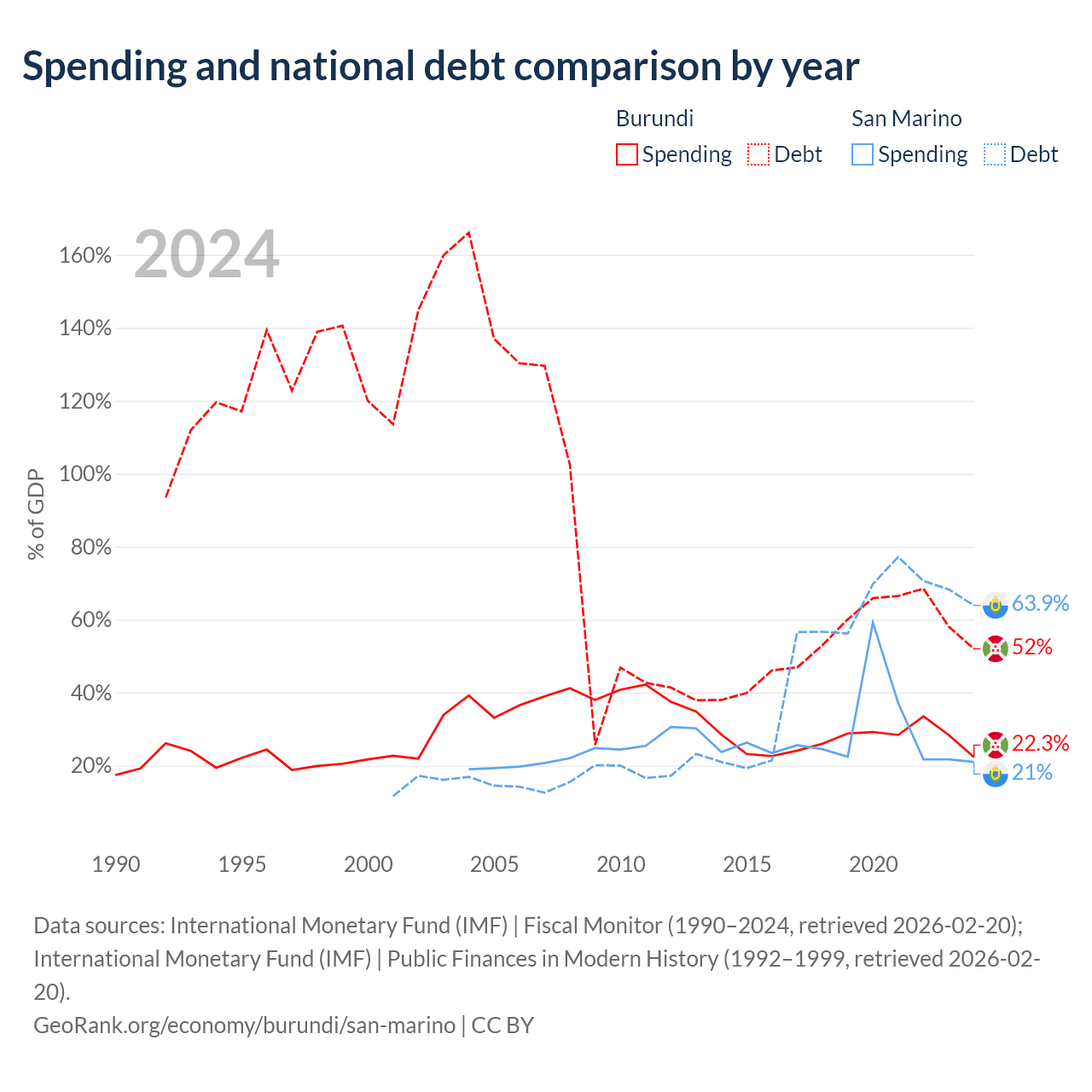 Burundi has $1.6B in government debt (52% of GDP), compared to $1.39B (63.9% of GDP) in San Marino.