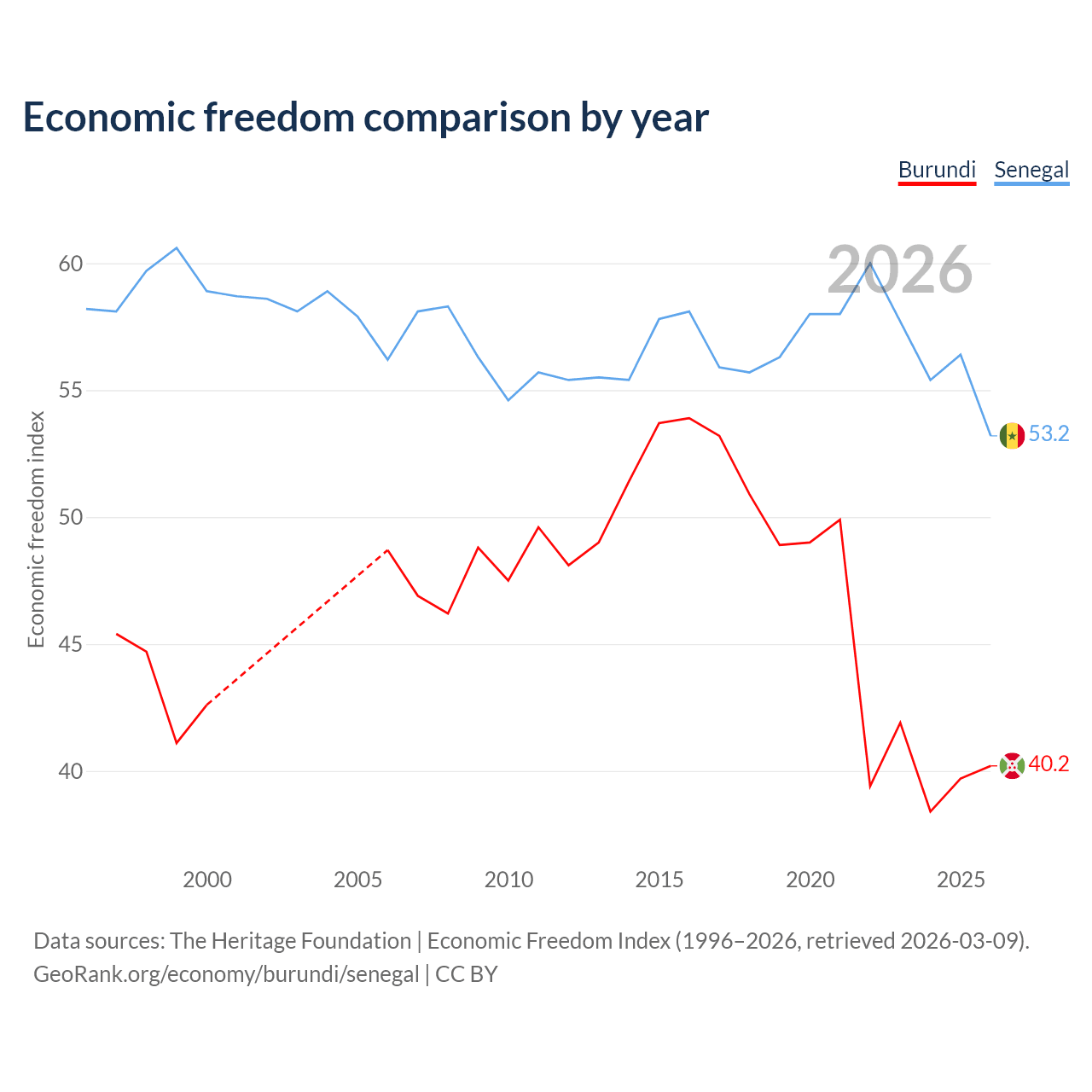 The Economic Freedom Index for Burundi is 40.2, ranking 187/197, compared to 53.2 for Senegal, ranking 140/197. The chart above displays a comparison of annual changes in economic freedom indexes.