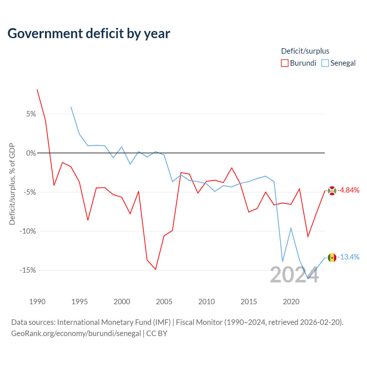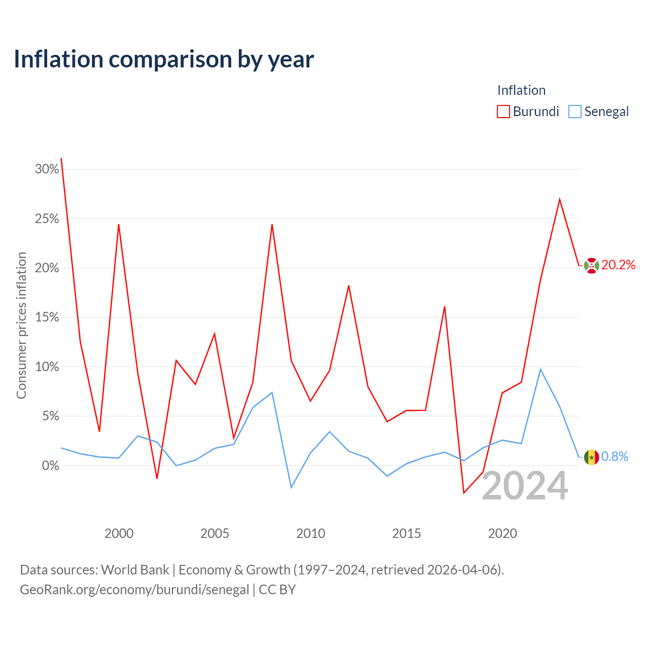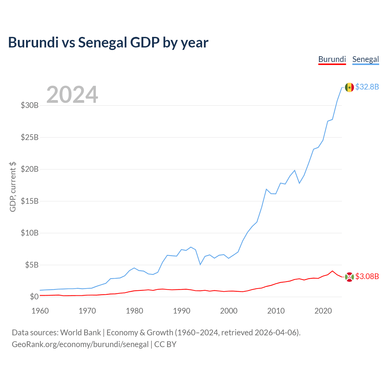 Burundi has a GDP of $3.08B compared to $32.8B for Senegal, ranking 169/197 and 109/197 by economy size, respectively.
