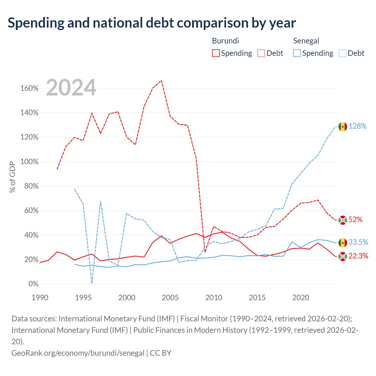 Burundi has $1.6B in government debt (52% of GDP), compared to $42.1B (128.4% of GDP) in Senegal.
