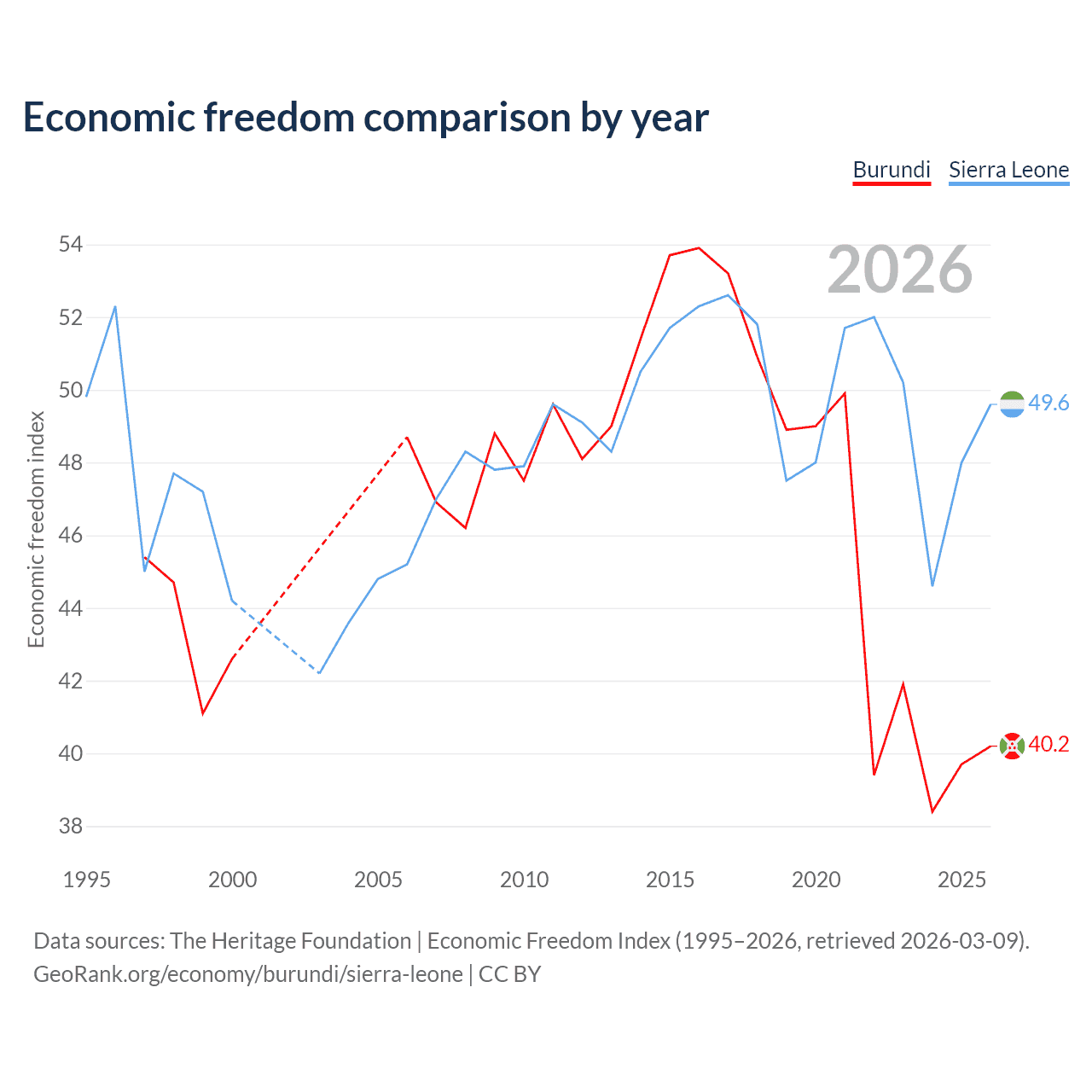 The Economic Freedom Index for Burundi is 40.2, ranking 187/197, compared to 49.6 for Sierra Leone, ranking 165/197. The chart above displays a comparison of annual changes in economic freedom indexes.