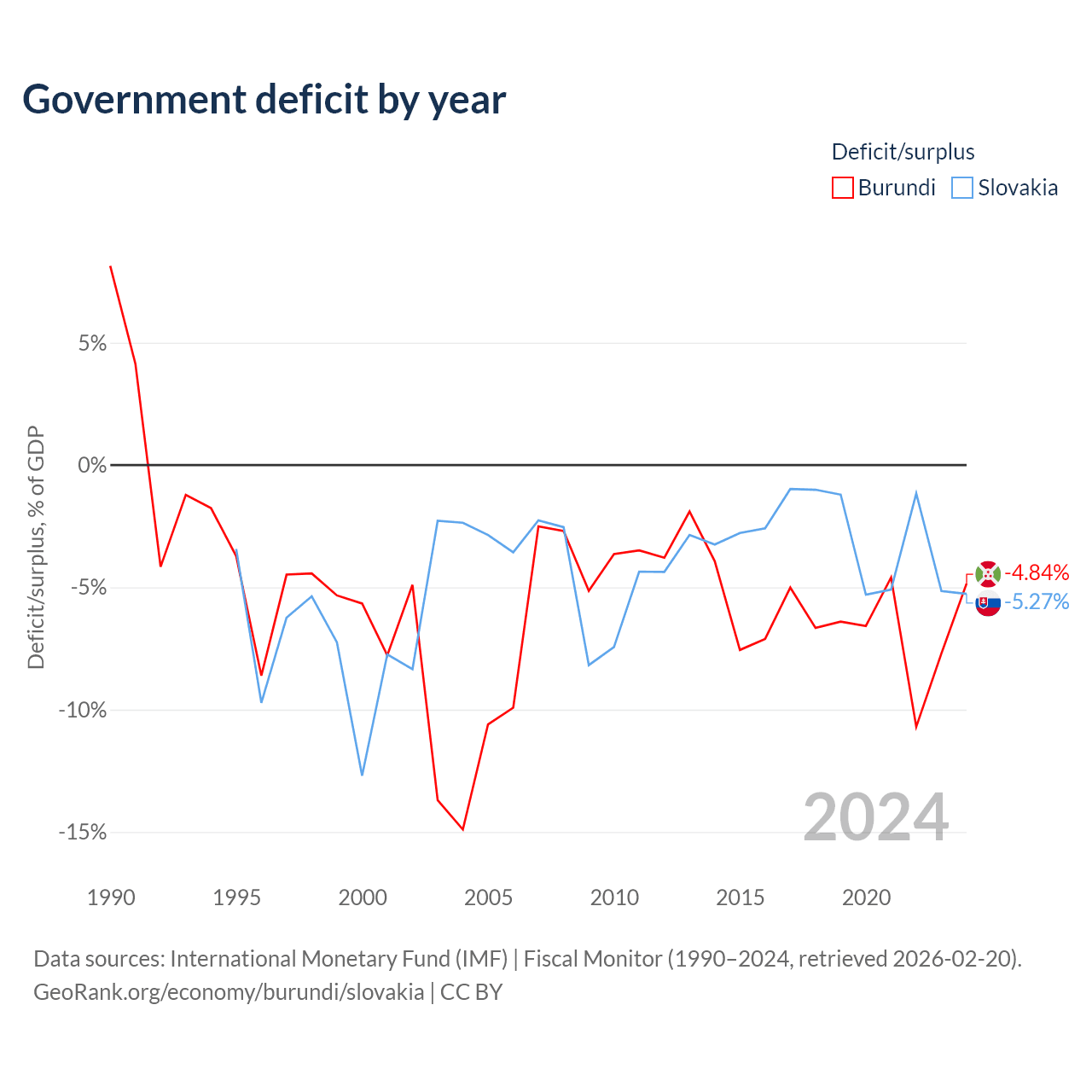Burundi has a GDP of $3.08B compared to $141B for Slovakia, ranking 169/197 and 61/197 by economy size, respectively.