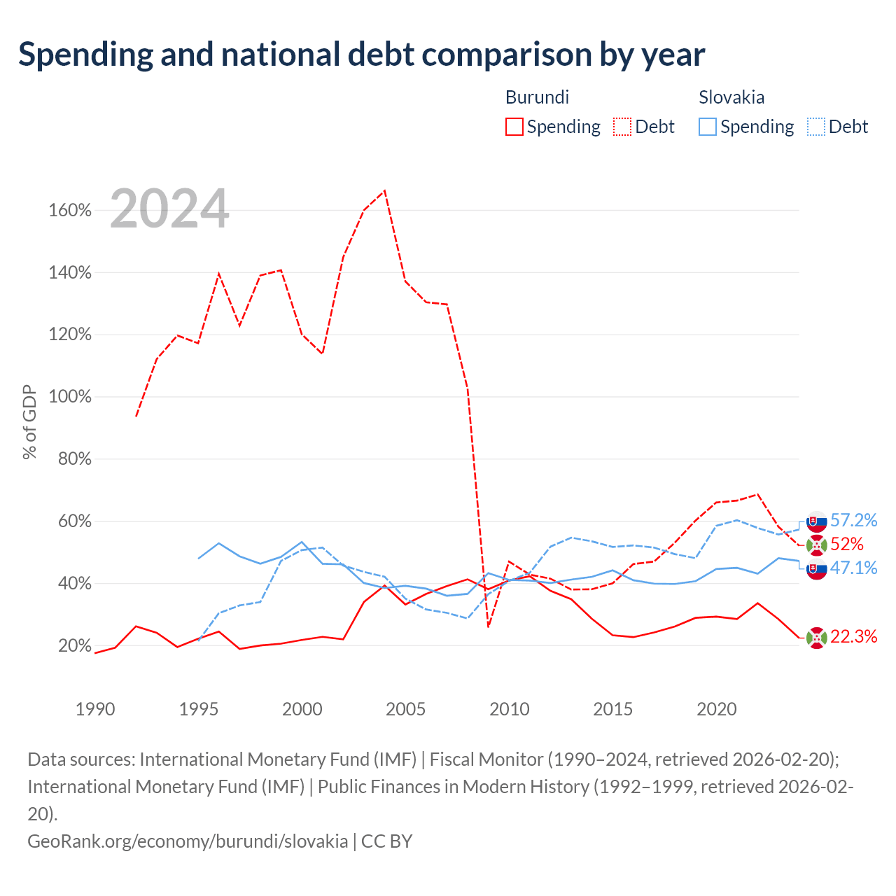 Burundi has $1.6B in government debt (52% of GDP), compared to $80.7B (57.2% of GDP) in Slovakia.