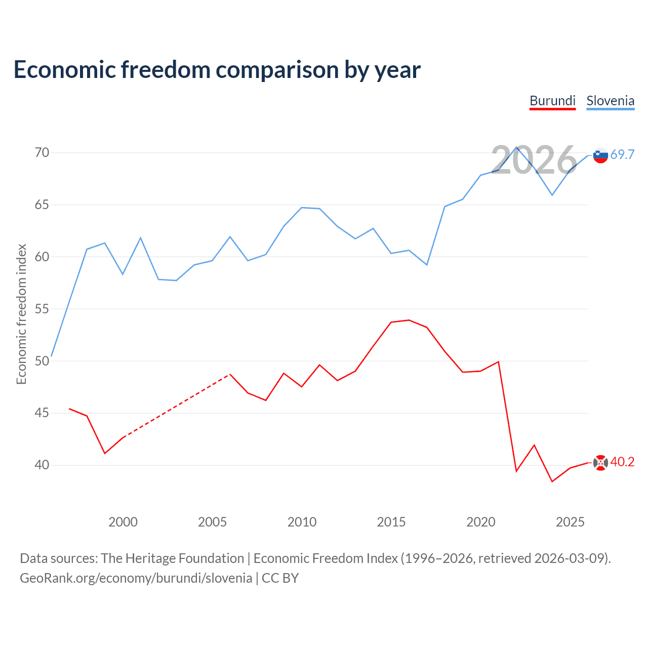 The Economic Freedom Index for Burundi is 40.2, ranking 187/197, compared to 69.7 for Slovenia, ranking 40/197. The chart above displays a comparison of annual changes in economic freedom indexes.