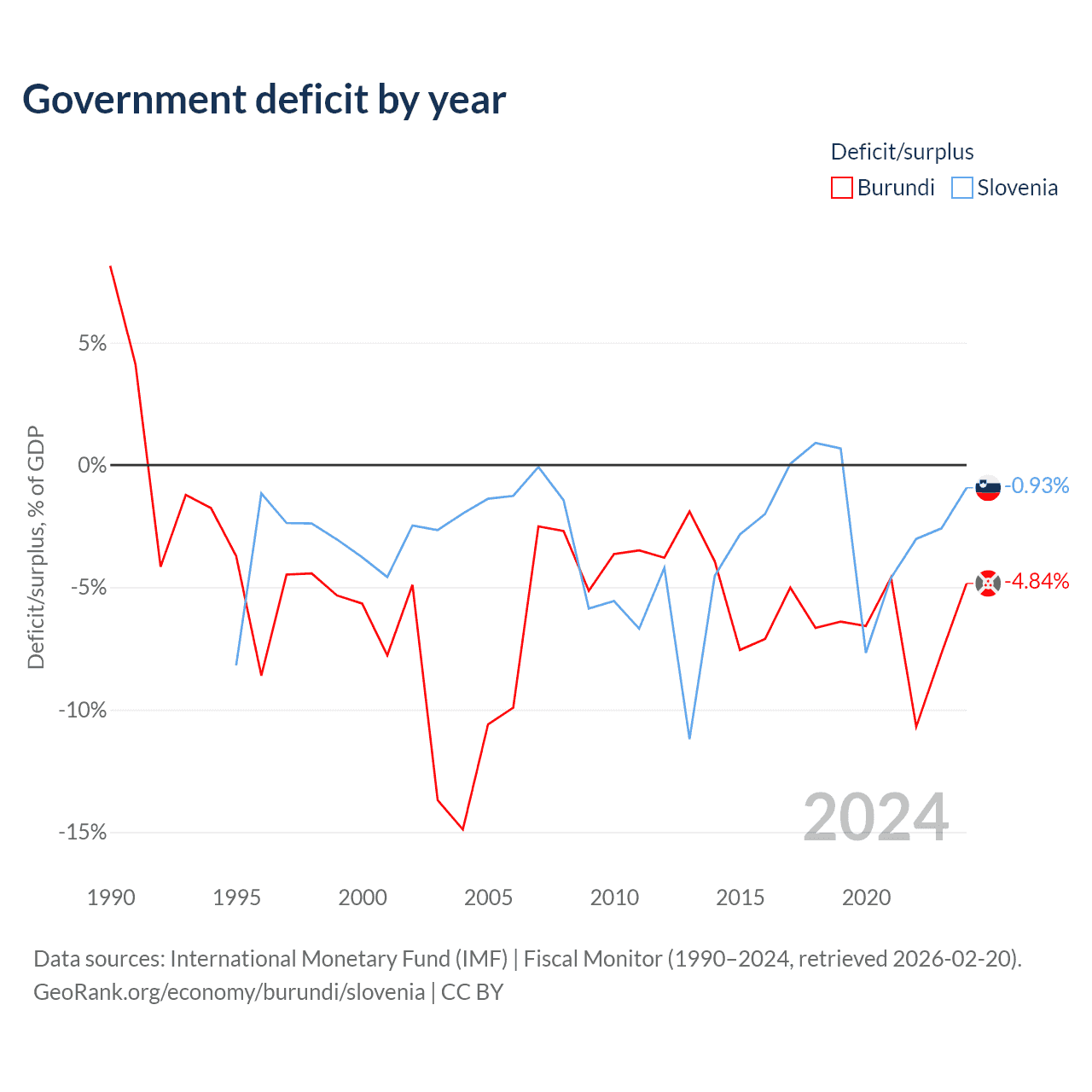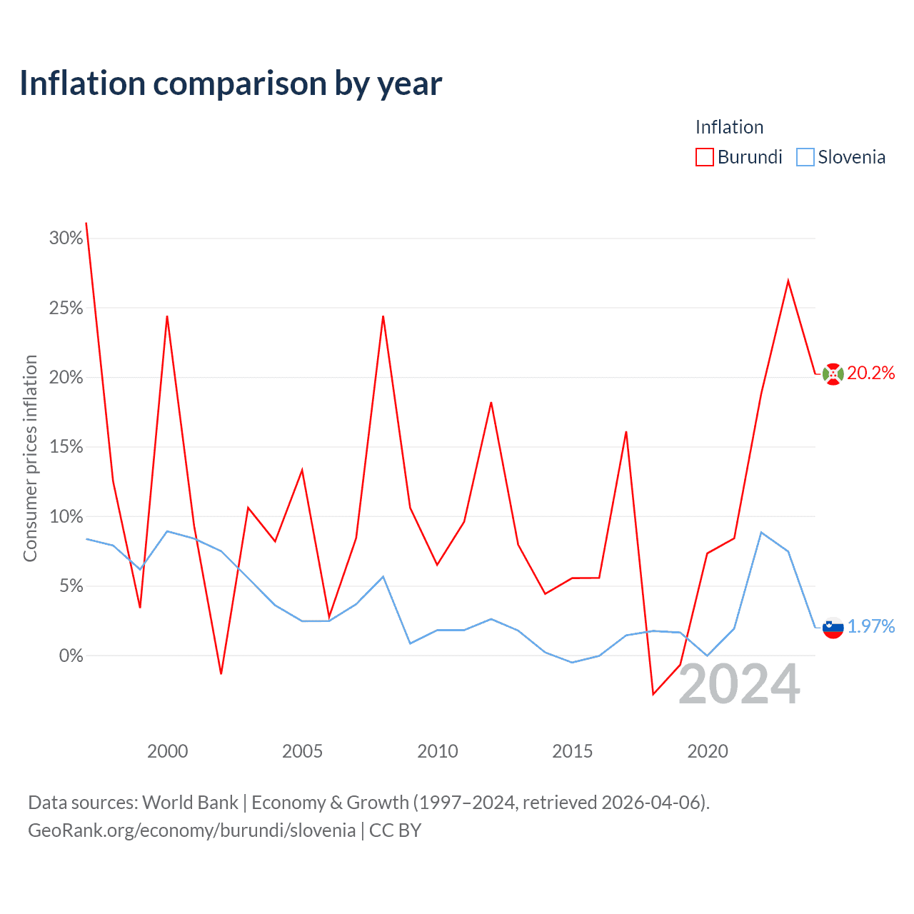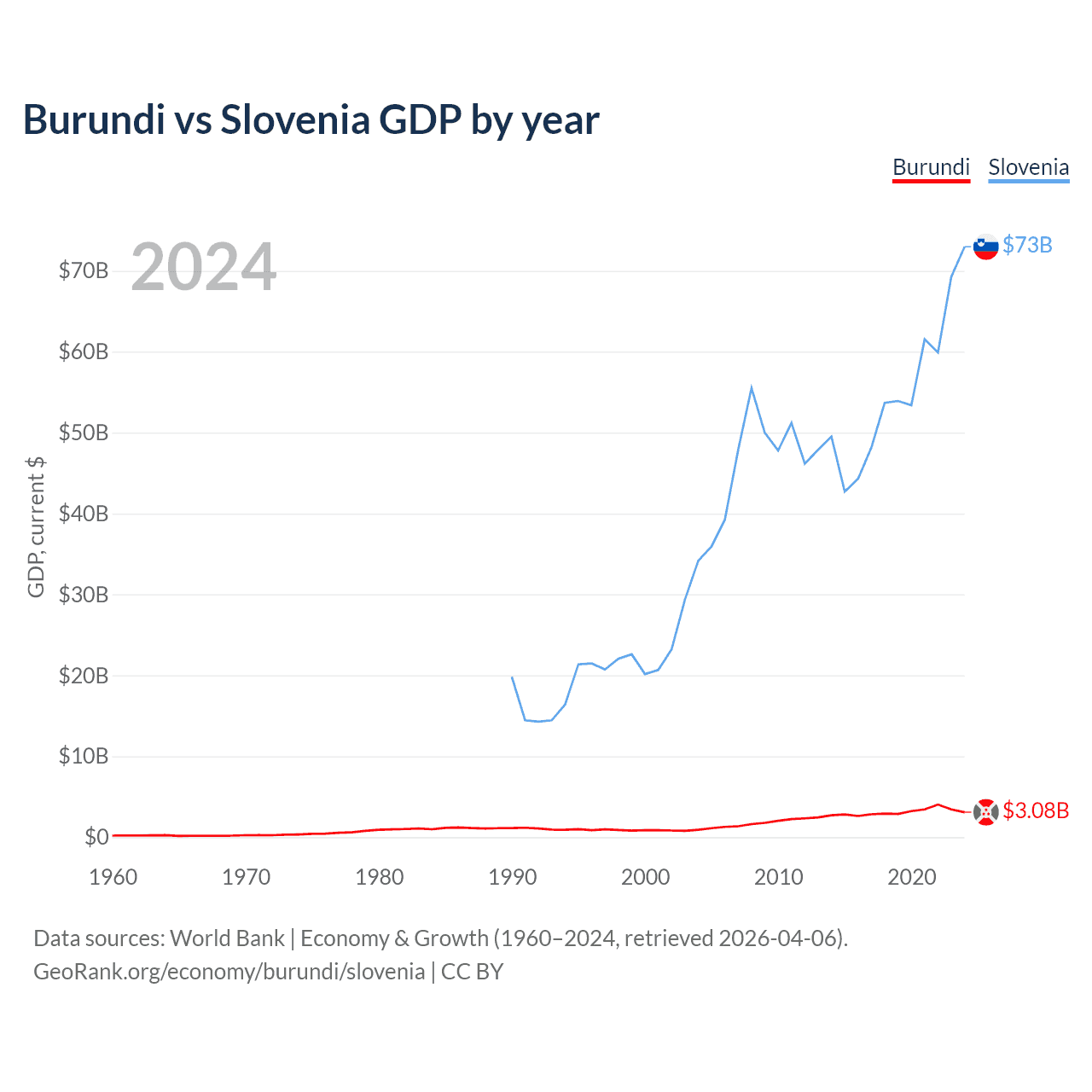 Burundi has a GDP of $3.08B compared to $73B for Slovenia, ranking 169/197 and 86/197 by economy size, respectively.