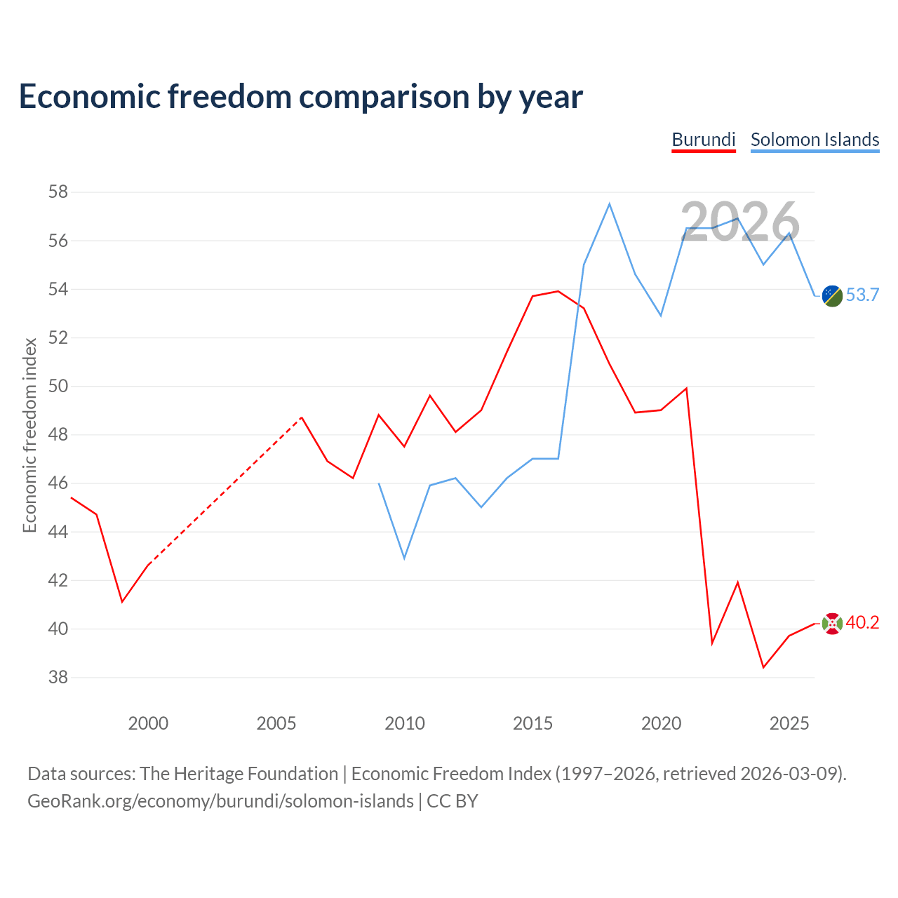 The Economic Freedom Index for Burundi is 40.2, ranking 187/197, compared to 53.7 for the Solomon Islands, ranking 137/197. The chart above displays a comparison of annual changes in economic freedom indexes.