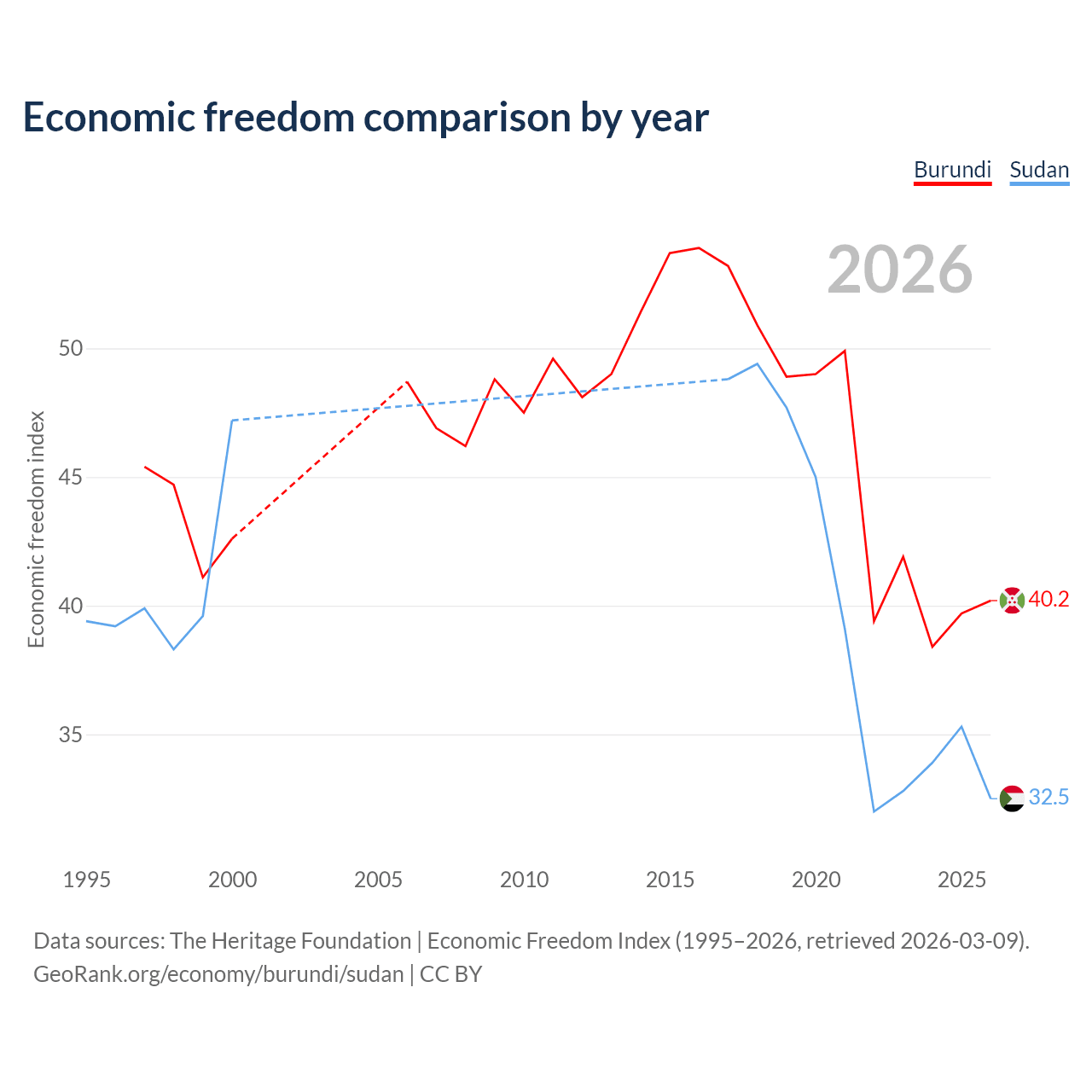 The Economic Freedom Index for Burundi is 40.2, ranking 187/197, compared to 32.5 for Sudan, ranking 191/197. The chart above displays a comparison of annual changes in economic freedom indexes.