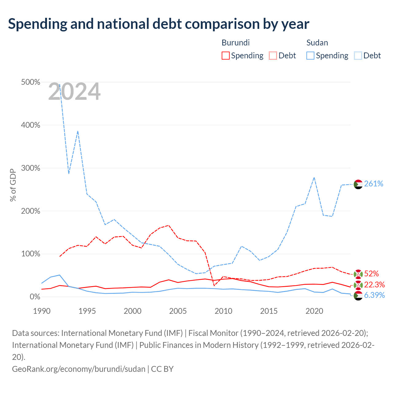 Burundi has $1.6B in government debt (52% of GDP), compared to $130B (261.4% of GDP) in Sudan.