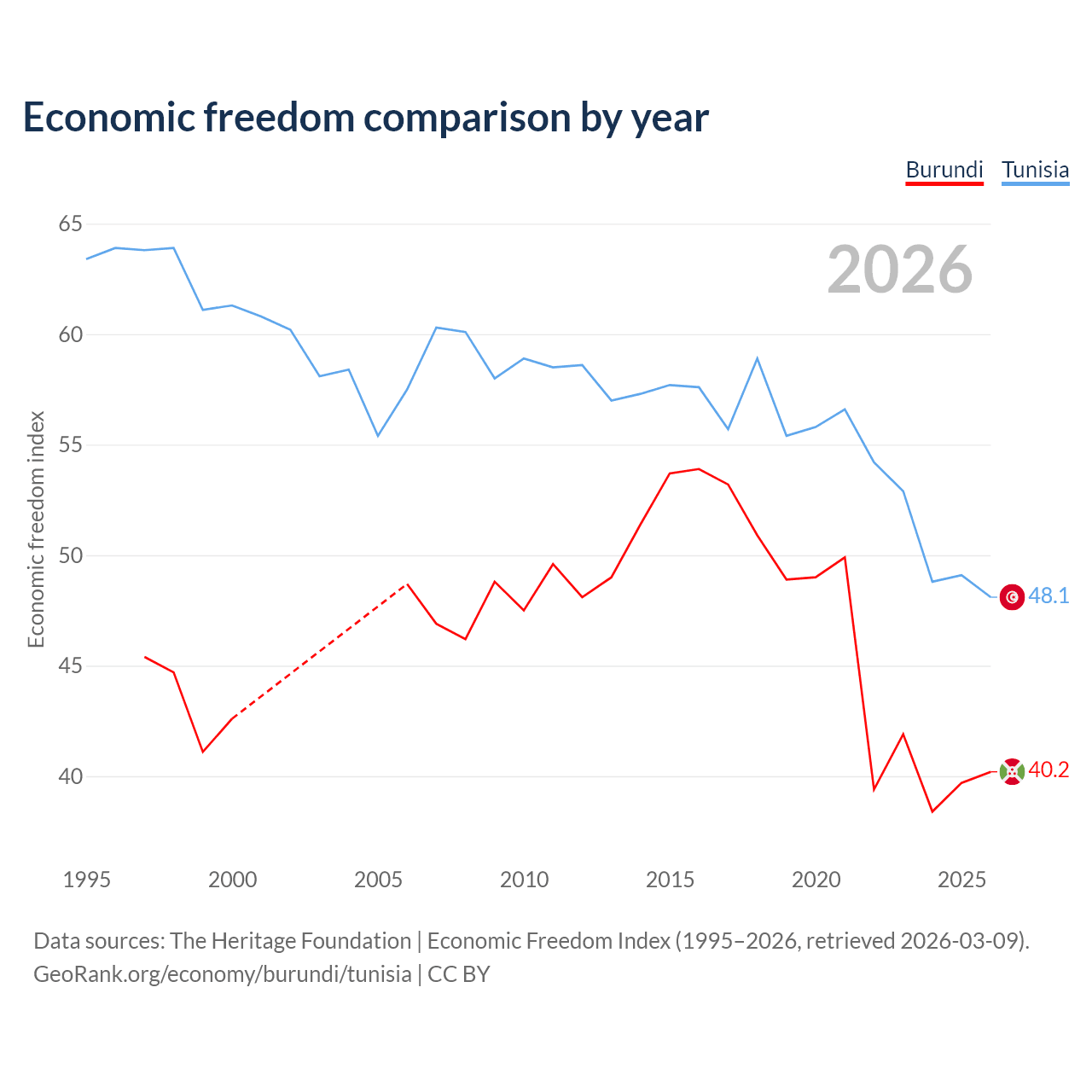 The Economic Freedom Index for Burundi is 40.2, ranking 187/197, compared to 48.1 for Tunisia, ranking 172/197. The chart above displays a comparison of annual changes in economic freedom indexes.