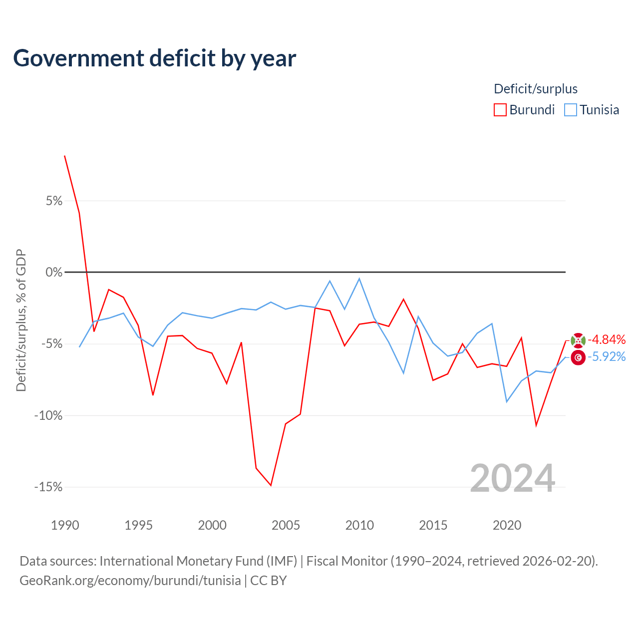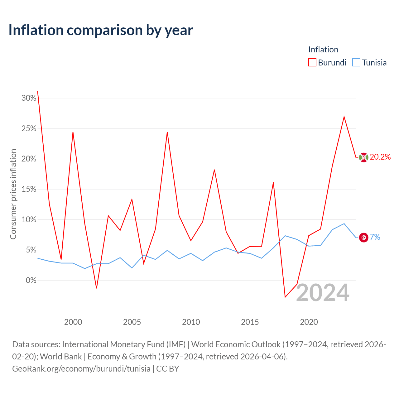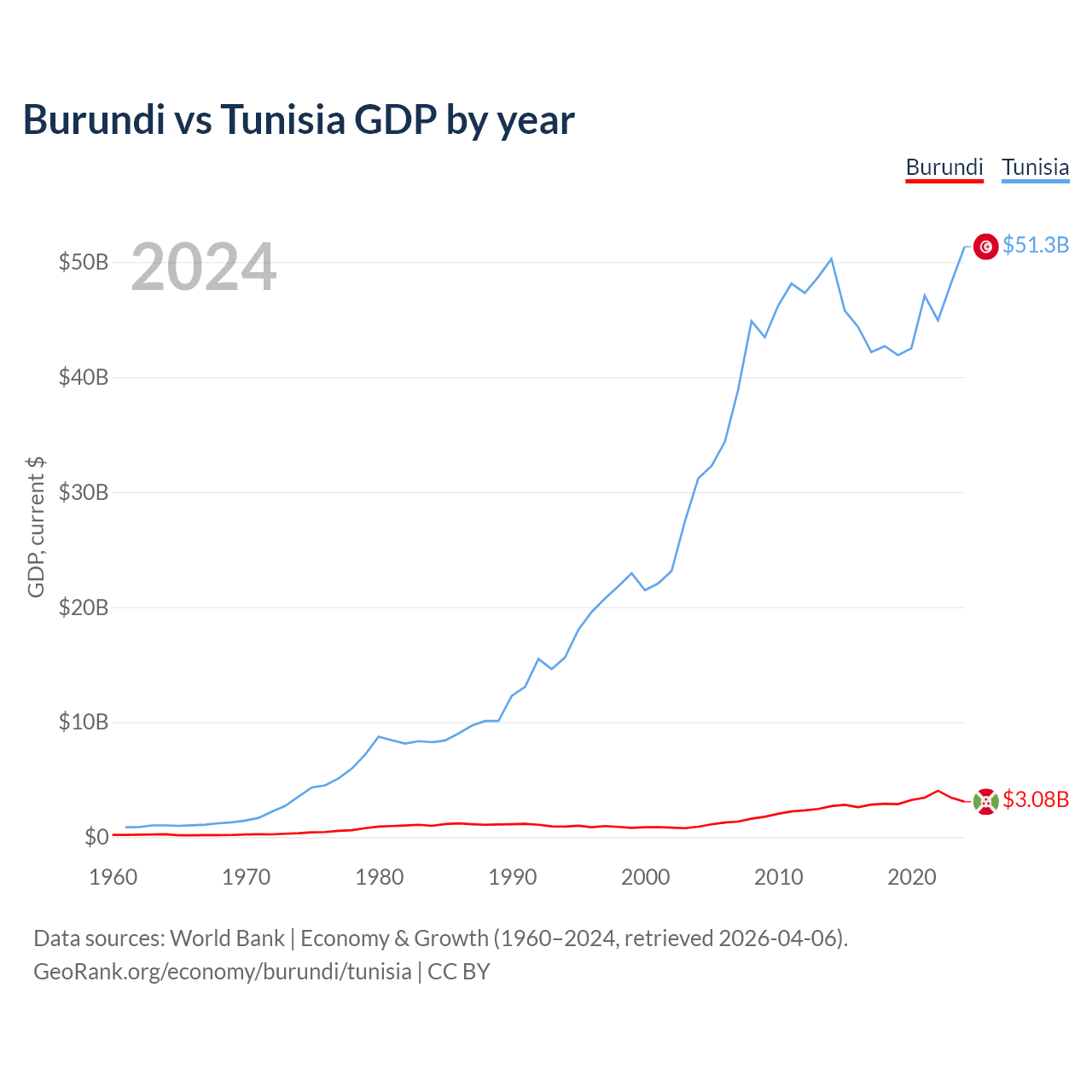 Burundi has a GDP of $3.08B compared to $51.3B for Tunisia, ranking 169/197 and 93/197 by economy size, respectively.