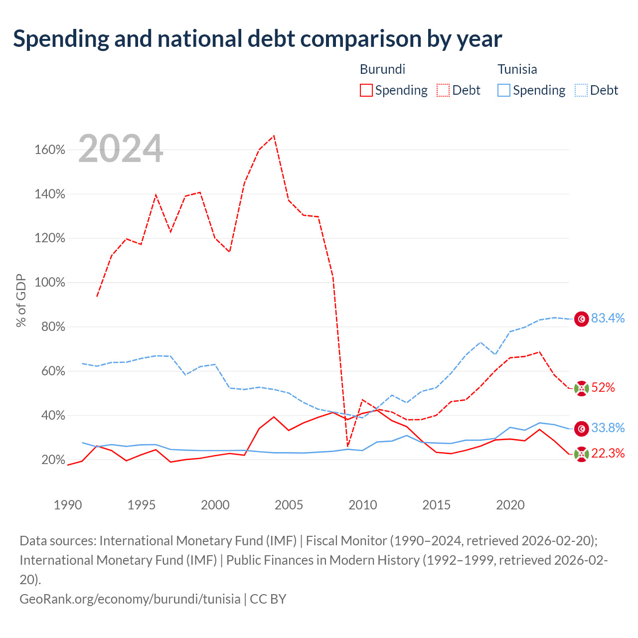 Burundi has $1.6B in government debt (52% of GDP), compared to $42.8B (83.4% of GDP) in Tunisia.