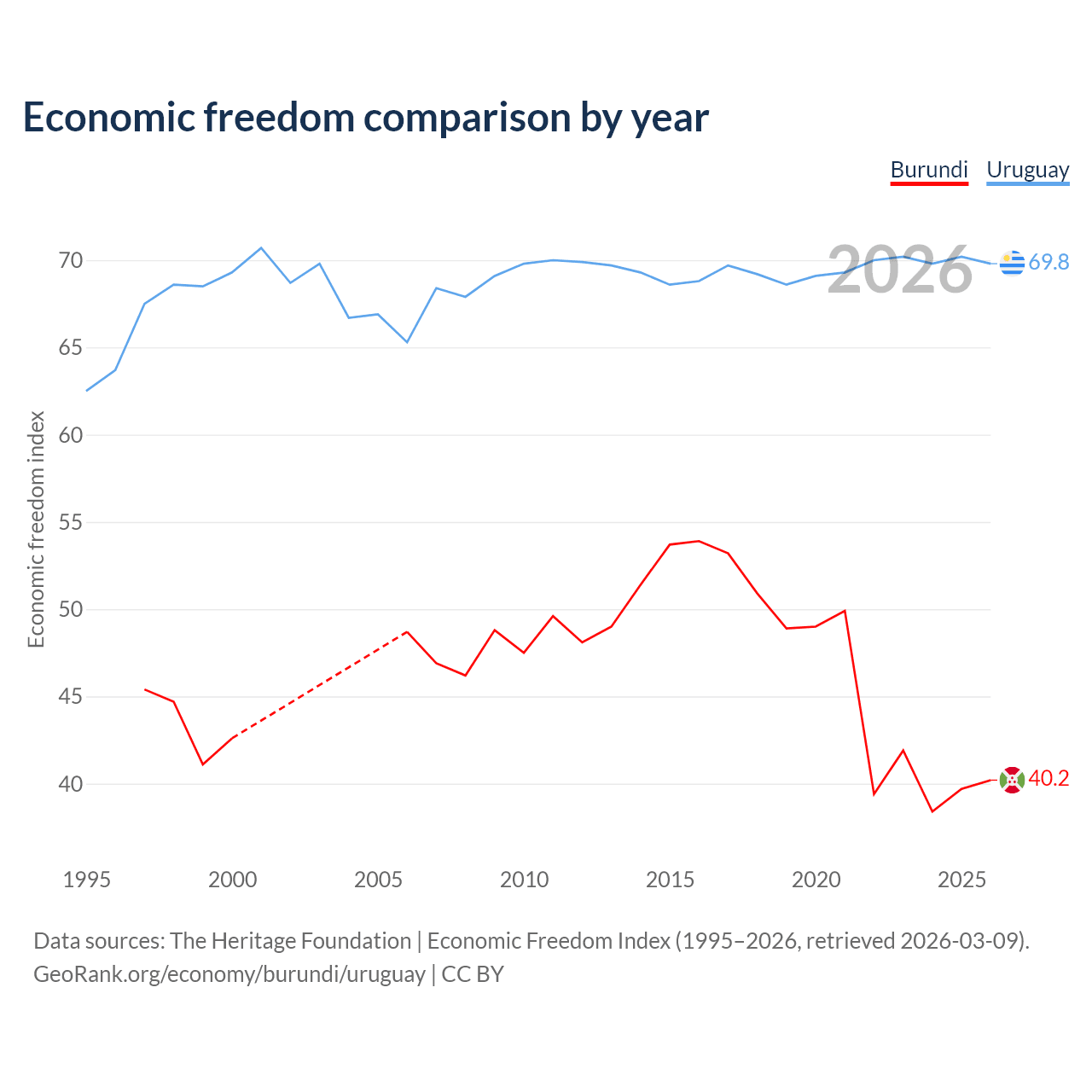 The Economic Freedom Index for Burundi is 40.2, ranking 187/197, compared to 69.8 for Uruguay, ranking 39/197. The chart above displays a comparison of annual changes in economic freedom indexes.