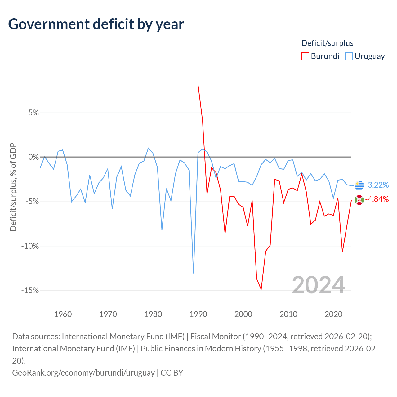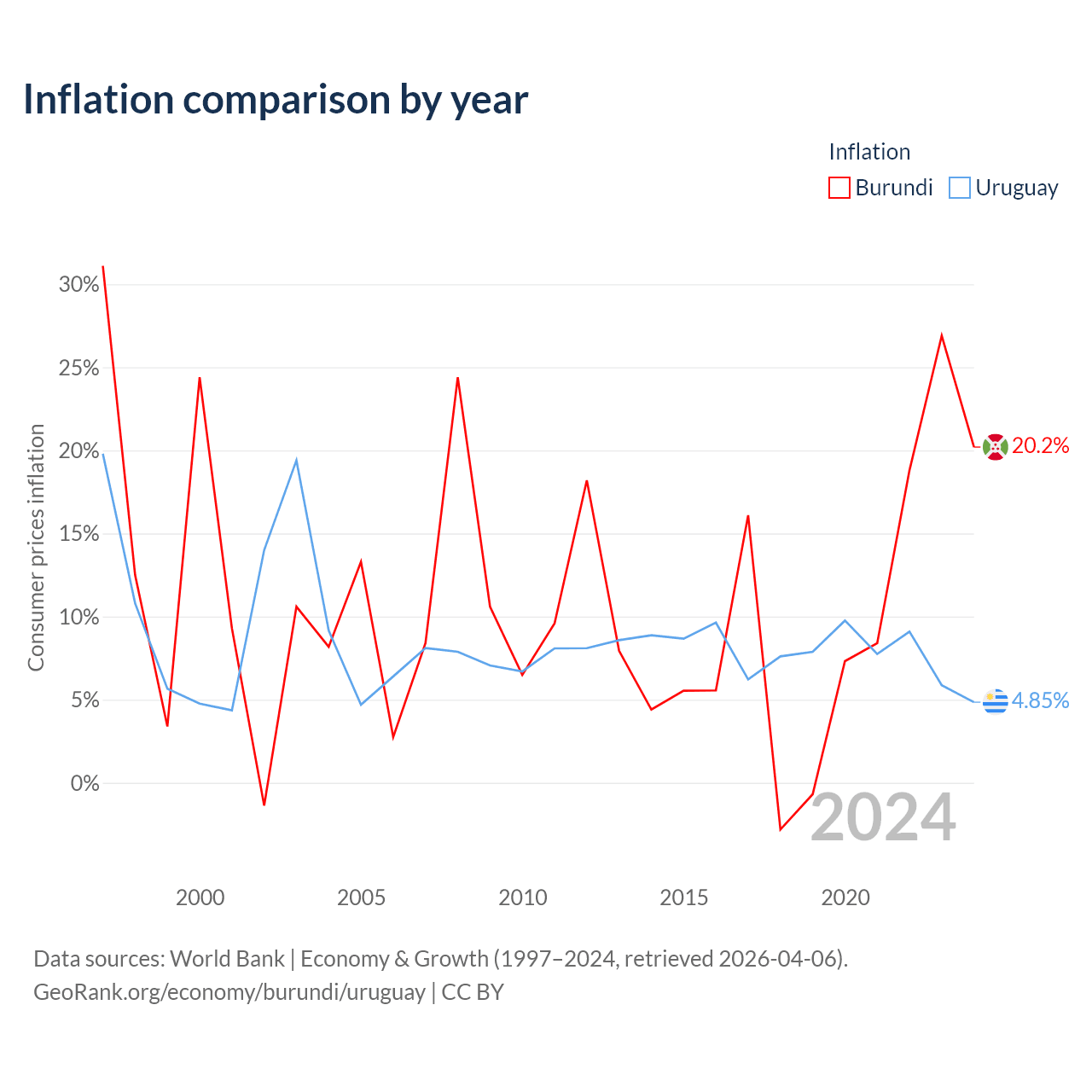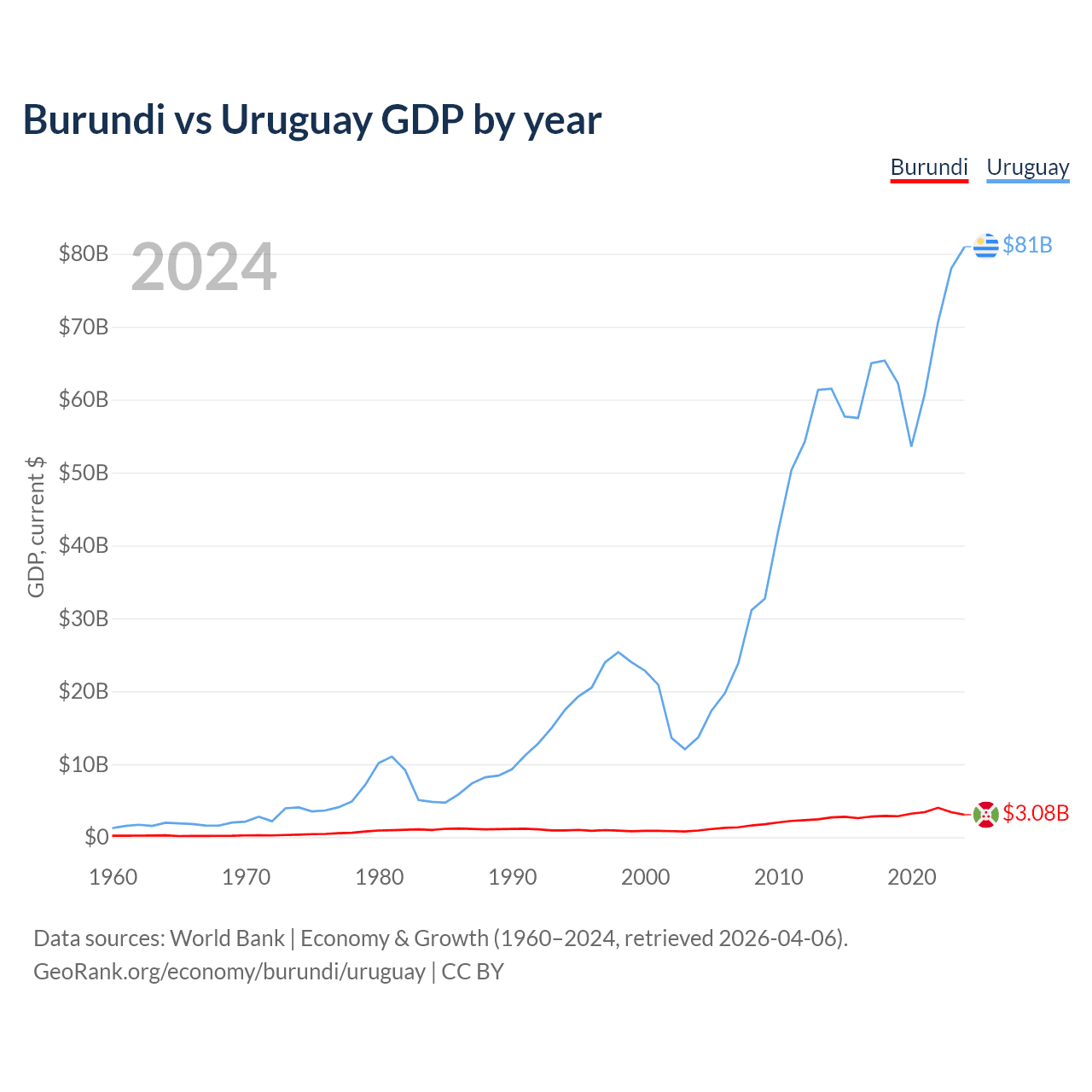 Burundi has a GDP of $3.08B compared to $81B for Uruguay, ranking 169/197 and 81/197 by economy size, respectively.