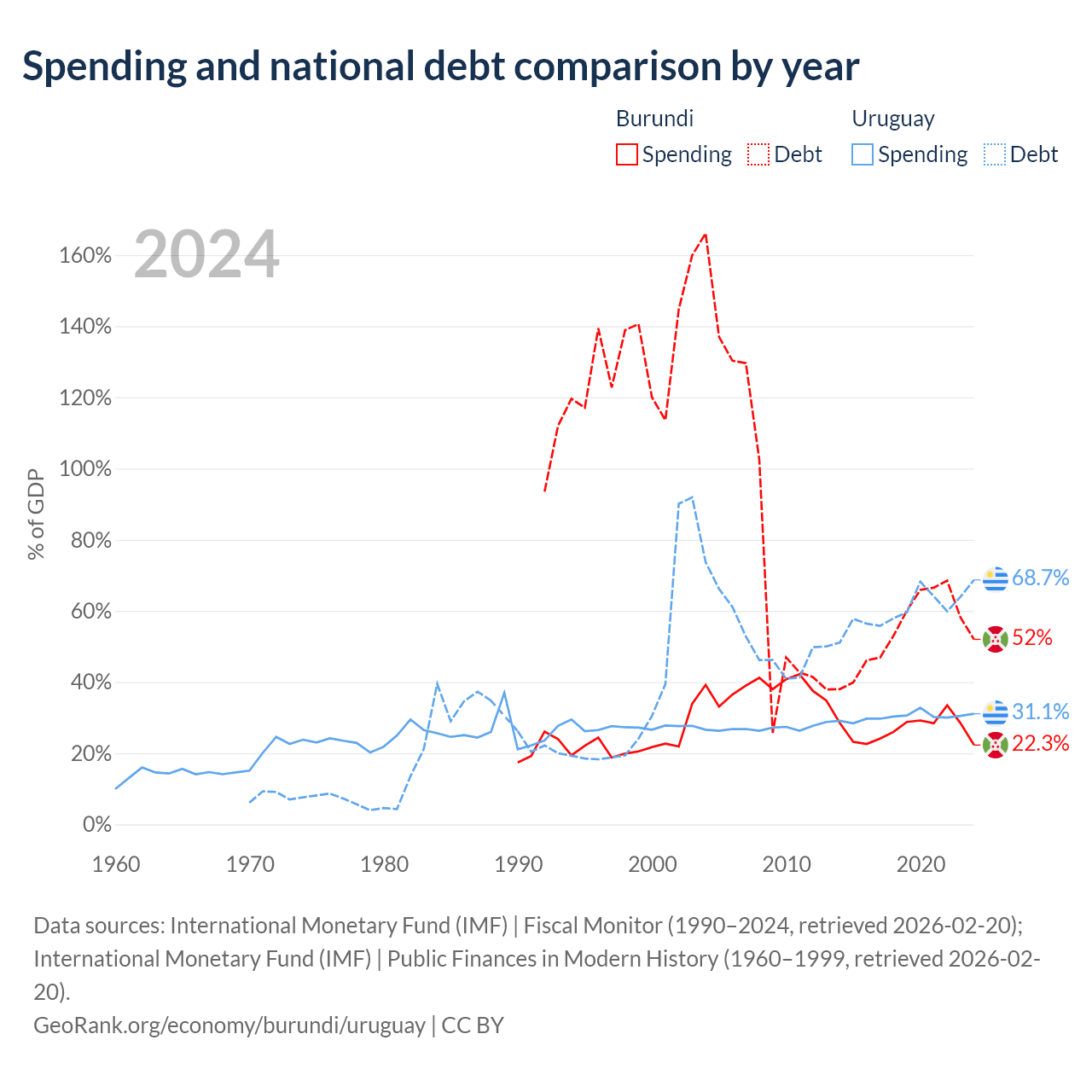 Burundi has $1.6B in government debt (52% of GDP), compared to $55.6B (68.7% of GDP) in Uruguay.
